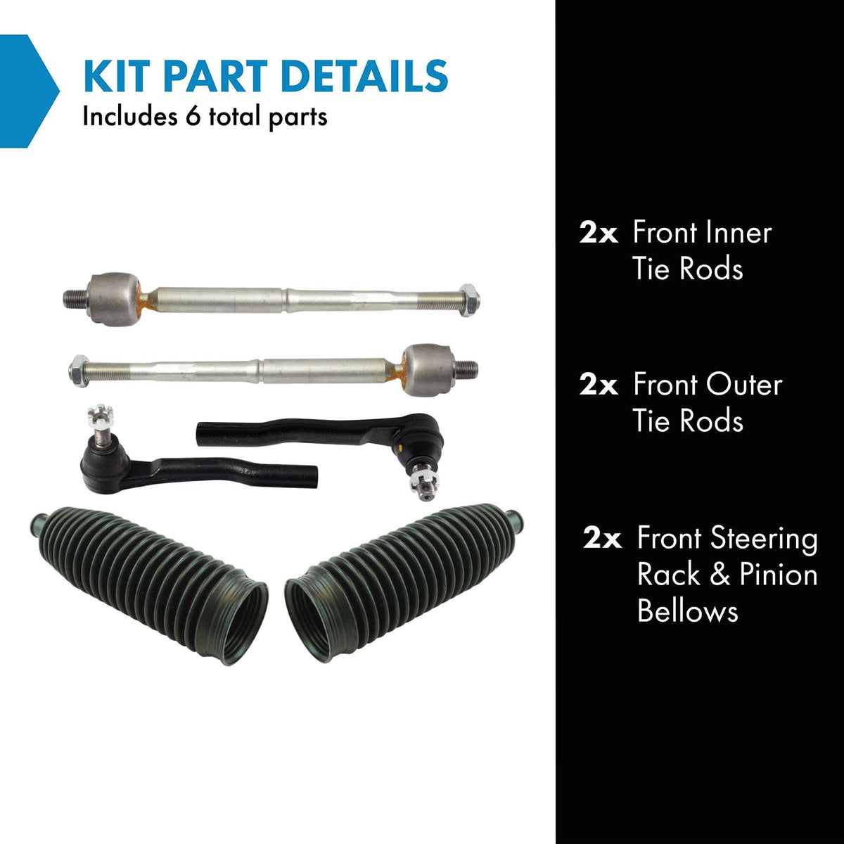6 Piece Steering KitKit Includes(2) Front Inner Tie Rods(2) Front Outer Tie Rods(2) Front Steering Rack & Pinion BellowsFitmentCompatible with: 2016-22 Honda HR-V FrontProduct AttributesQuantity: 6 PieceProduct Features Application Specific Design: No modifications necessary Anti-Corrosion Coated: Enhanced surface life Pre-greased: No additional maintenance required Kitted for Restored Performance: Improved road-feel and handlingItem DetailsTRQ suspension kits are manufactured using premium raw materials and coatings for extended service life. Each TRQ suspension component is designed to be a direct, maintenance-free replacement to the stock unit. To extend the life of your steering and suspension components, TRQ recommends replacing components in pairs, sets, or kits. All products are fit and road-tested in our Massachusetts R&D facility to ensure we deliver on our promise of Trusted Reliable Quality.Reference NumbersAutopart International: 2600548640Beck/Arnley: 101-8405, 101-8437, 101-8438Datsun/Nissan: 53010-T7W-003Delphi: TA6377DIY Solutions: SUS07235Dorman - Premium: TO59351XL, TO59352XLEMPI: 88-1639-KHonda: 53010T7W003, 53540T7J003, 53560T7J003Mevotech: MS60660, MS60661, MS60740MOOG Chassis Products: ES801388, ES801389, EV801305NAPA Chassis Parts: 2694100, 2694153, 2694154