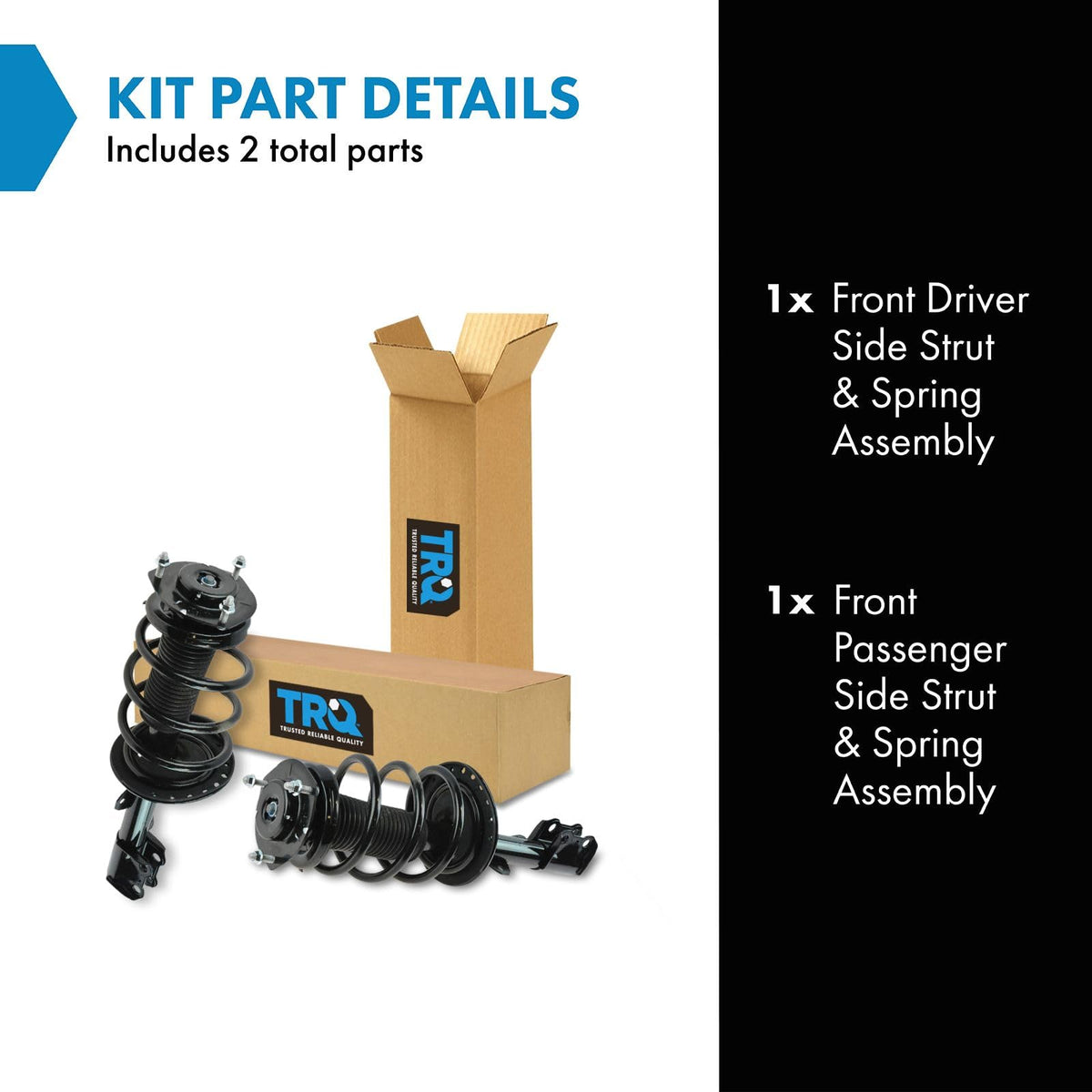 2 Piece Strut & Spring Assembly SetKit Includes(1) Front Driver Side Strut & Spring Assembly(1) Front Passenger Side Strut & Spring AssemblyFitmentCompatible with: 2010-15 Lexus RX350 without Air Suspension Front Driver & Passenger SideCompatible with: 2011-13 Toyota Highlander Front Driver & Passenger SideCompatible with: 2010-15 Lexus RX450h without Air Suspension Front Driver & Passenger SideProduct AttributesQuantity: 2 PieceProduct Features Loaded Struts: Pre-assembled application specific design Application Specific Design: No modifications necessary Matched Pair: Improved comfort and extended service life Restored Performance: Reduced body sway and vibrationItem DetailsTRQ fully loaded shocks and struts are manufactured using premium raw materials and calibrated to restore original ride comfort. TRQ shocks are fully loaded featuring a pre-loaded bearing plate, upper and lower spring isolator, upper spring seat, coil spring, boot kit, and premium strut. TRQ recommends replacing your shocks or struts in pairs to ensure even wear of components and improved ride comfort. All products are fit and road-tested in our Massachusetts R&D facility to ensure we deliver on our promise of Trusted Reliable Quality.Reference NumbersKYB: SR4452, SR4453Monroe Shocks & Struts: 172765, 172766Unity Automotive: 11627, 11628