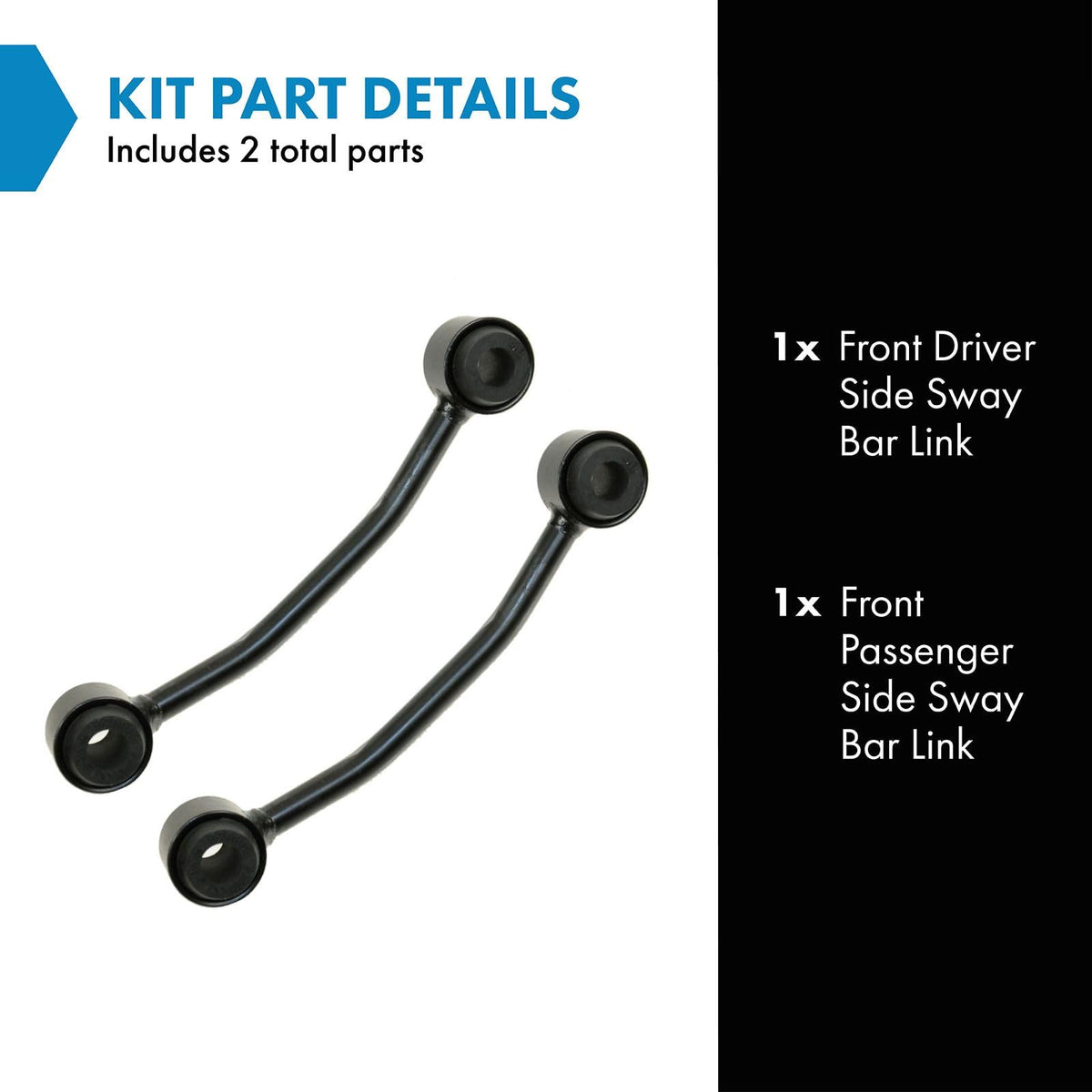 2 Piece Sway Bar Link SetKit Includes(1) Front Driver Side Sway Bar Link(1) Front Passenger Side Sway Bar LinkFitmentCompatible with: 1987-95 Jeep Wrangler Front Driver & Passenger SideProduct AttributesQuantity: 2 PieceReference NumbersChrysler: 52002609DIY Solutions: SUS01572, SUS06830Mevotech: MK3200MOOG Chassis Products: K3200Mopar: 520026098QuickSteer: K3200
