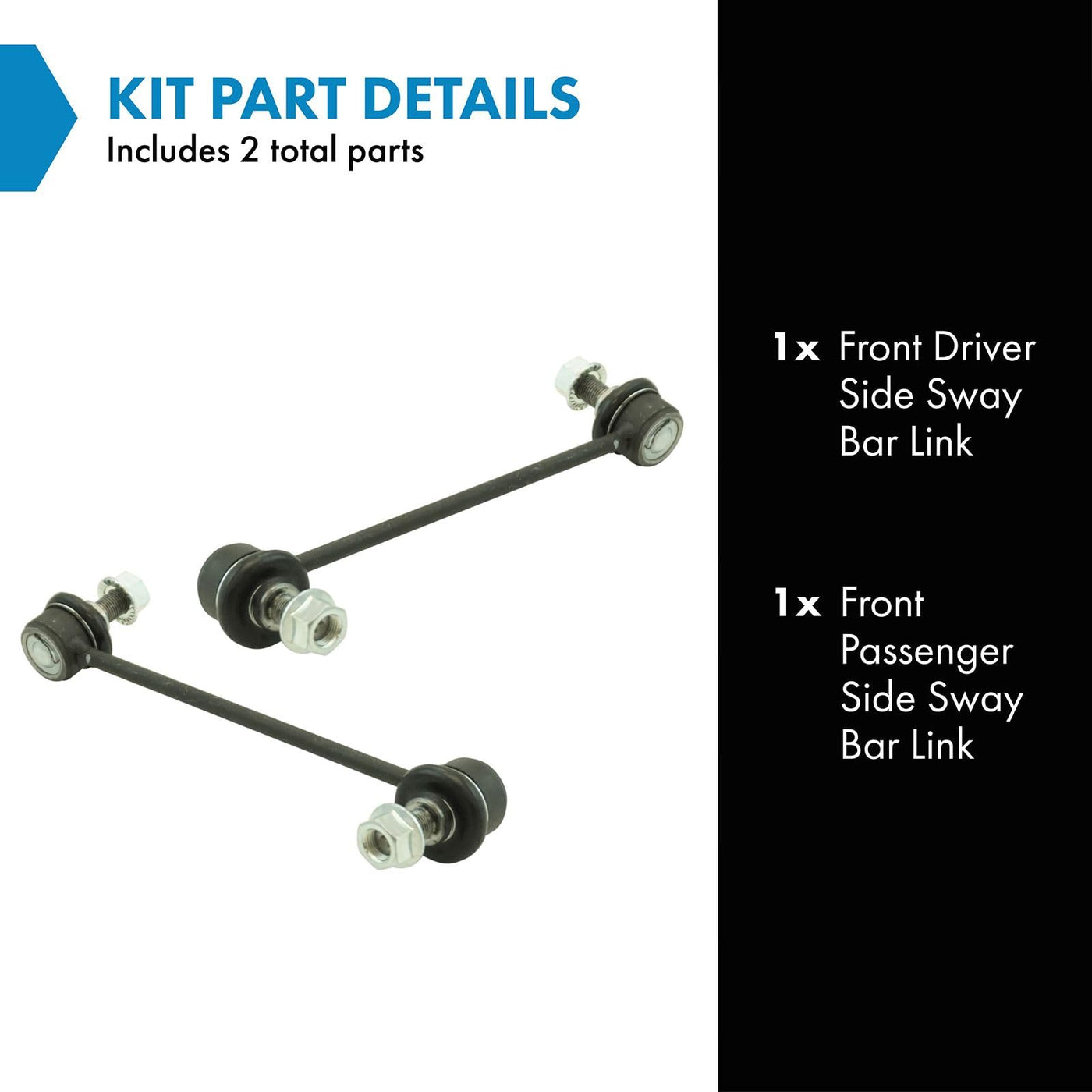 2 Piece Sway Bar Link SetKit Includes(1) Front Driver Side Sway Bar Link(1) Front Passenger Side Sway Bar LinkFitmentCompatible with: 2010-13 Kia Soul Front Driver & Passenger SideProduct AttributesQuantity: 2 PieceReference NumbersDIY Solutions: SUS03682, SUS07101, SUS07102Mevotech: MS90861, MS90862MOOG Chassis Products: K750597, K750598