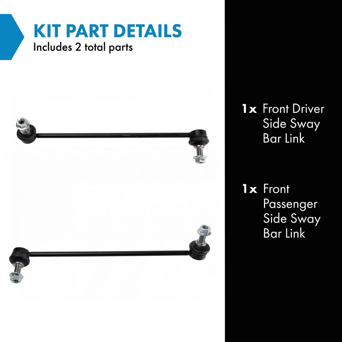 2 Piece Sway Bar Link SetKit Includes(1) Front Driver Side Sway Bar Link(1) Front Passenger Side Sway Bar LinkFitmentCompatible with: 2011-17 BMW X3 Front Driver & Passenger SideCompatible with: 2015-16 BMW X4 Front Driver & Passenger SideCompatible with: 2017-18 BMW X4 xDrive28i Front Driver & Passenger SideProduct AttributesQuantity: 2 PieceReference NumbersBeck/Arnley: 101-7401, 101-7402BMW: 31306787163, 31306787164Mevotech: MS108161, MS108162MOOG Chassis Products: K750607, K750608RTS: 97-99514-1, 97-99514-2