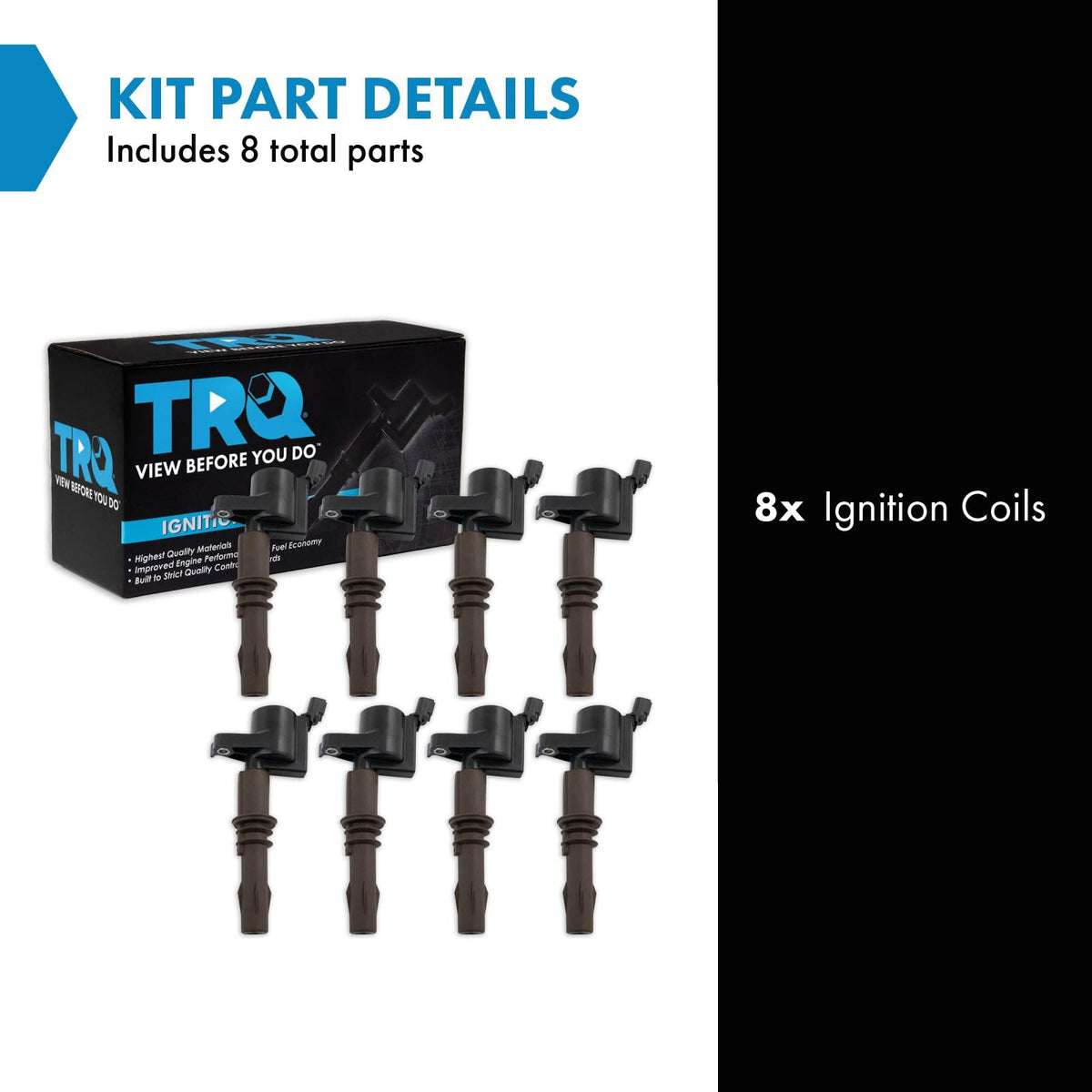 8 Piece Ignition Coil SetKit Includes(8) Ignition CoilsFitmentCompatible with: 2007-08 Ford F150 Truck V8 5.4L with Brown Ignition Coil BootCompatible with: 2009-10 Ford F150 Truck V8 4.6L 24 ValveCompatible with: 2009-10 Ford F150 Truck V8 5.4LCompatible with: 2009-14 Ford Expedition V8 5.4LCompatible with: 2008 Ford F250 Super Duty Truck V8 5.4L with Brown Ignition Coil BootCompatible with: 2008 Ford F350 Super Duty Truck V8 5.4L with Brown Ignition Coil BootCompatible with: 2009-10 Ford F250 Super Duty Truck V8 5.4LCompatible with: 2009-10 Ford Mustang V8 4.6LCompatible with: 2009-10 Ford Explorer V8 4.6LCompatible with: 2008 Ford Mustang V8 4.6L with Brown Ignition Coil BootCompatible with: 2008 Ford Explorer V8 4.6L with Brown Ignition Coil BootCompatible with: 2008 Ford Expedition V8 5.4L From 10/01/07 Production DateCompatible with: 2009-14 Lincoln Navigator V8 5.4LCompatible with: 2010 Ford F350 Super Duty Truck V8 5.4L with Mexico EmissionsCompatible with: 2009 Ford F350 Super Duty Truck V8 5.4LCompatible with: 2008 Ford Explorer Sport Trac V8 4.6L with Brown Ignition Coil BootCompatible with: 2009-10 Ford Explorer Sport Trac V8 4.6LCompatible with: 2008 Lincoln Navigator V8 5.4L with Brown Ignition Coil BootCompatible with: 2008 Mercury Mountaineer V8 4.6L with Brown Ignition Coil BootCompatible with: 2009-10 Mercury Mountaineer V8 4.6LCompatible with: 2021 Ford F750 Truck V8 7.3LCompatible with: 2021 Ford F650 Truck V8 7.3LProduct AttributesQuantity: 8 PieceIgnition Coil Color: BlackIgnition Coil Type: Direct ReplacementProduct Features Enhanced Efficiency: Up to 15% more energy transferred to spark plugs High Temperature Epoxy: Enhanced service life Faster rise times and duration Improved throttle responseItem DetailsTRQ ignition coils will have your engine running like new. TRQ ignition coils are manufactured to precise specifications using premium raw materials to optimize each vehicle's ignition system. To ensure peak performance, TRQ recommends replacing ignition coils in sets to prevent electrical output imbalances. All products are fit and road-tested in our Massachusetts R&D facility to ensure we deliver on our promise of Trusted Reliable Quality.Reference NumbersAirtex: 5C1716BWD: E509Carquest: 52-2071Delphi: GN10233DENSO Auto Parts: 673-6200Echlin: IC697Ford: 8L3Z-12029-A, 8L3Z12029AKarlyn: 5096Motorcraft: DG-521NAPA Mileage Plus: IC697SBOriginal Engine Management: 50107Spectra Premium: C-800Standard Ignition: FD-509Standard Motor Products: FD509Walker Products: 921-2066Wells: C1659