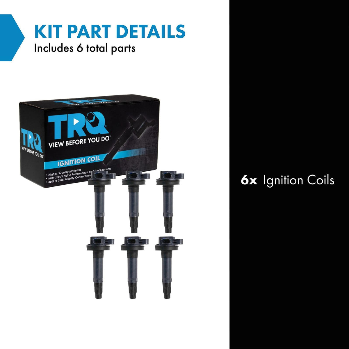 6 Piece Ignition Coil SetKit Includes(6) Ignition CoilsFitmentCompatible with: 2016 Ford F150 Truck V6 3.5L Flex Fuel From 10/01/16 Production DateCompatible with: 2017 Ford F150 Truck V6 3.5L Flex FuelCompatible with: 2018-19 Ford Explorer V6 3.5L Naturally AspiratedCompatible with: 2017 Ford Explorer V6 3.5L Naturally Aspirated From 10/01/16 Production DateCompatible with: 2017-18 Ford Edge V6 3.5LCompatible with: 2018-19 Ford Transit T250 V6 3.7LCompatible with: 2016 Ford Edge V6 3.5L From 8/01/16 Production DateCompatible with: 2016 Ford Mustang V6 3.7L From 9/01/16 Production DateCompatible with: 2017 Ford Mustang V6 3.7LCompatible with: 2018-19 Ford Transit T350 V6 3.7LCompatible with: 2017-19 Ford Flex V6 3.5L Naturally AspiratedCompatible with: 2017-19 Ford Taurus V6 3.5LCompatible with: 2018-19 Ford Transit T150 V6 3.7LCompatible with: 2017-18 Lincoln MKX V6 3.7LCompatible with: 2017 Ford Transit T250 V6 3.7L From 10/01/16 Production DateCompatible with: 2018-19 Ford Police Interceptor Utility V6 3.7LCompatible with: 2016 Lincoln MKX V6 3.7L From 10/01/16 Production DateCompatible with: 2017 Ford Police Interceptor Utility V6 3.7L From 7/31/16 Production DateCompatible with: 2017 Ford Transit T350 V6 3.7L From 10/01/16 Production DateCompatible with: 2017-20 Lincoln Continental V6 3.7LCompatible with: 2016 Ford Taurus V6 3.5L Naturally Aspirated Flex Fuel From 8/01/16 Production DateCompatible with: 2016 Ford Taurus V6 3.5L Naturally Aspirated Gas Engine From 8/01/16 Production DateCompatible with: 2017 Ford Transit T150 V6 3.7L From 10/01/16 Production DateCompatible with: 2018-19 Ford Transit T350 HD V6 3.7LCompatible with: 2016 Ford Flex V6 3.5L Naturally Aspirated From 10/01/16 Production DateCompatible with: 2017-19 Ford Police Interceptor Sedan V6 3.7LCompatible with: 2018-19 Ford Police Interceptor Sedan V6 3.5L Gas EngineCompatible with: 2017-19 Lincoln MKT V6 3.7LCompatible with: 2017 Ford Transit T350 HD V6 3.7L From 10/01/16 Production DateCompatible with: 2017 Ford Police Interceptor Sedan V6 3.5L Naturally Aspirated Flex FuelCompatible with: 2017 Ford Police Interceptor Sedan V6 3.5L Naturally Aspirated Gas EngineCompatible with: 2016 Lincoln MKT V6 3.7L From 10/01/16 Production DateProduct AttributesQuantity: 6 PieceIgnition Coil Color: BlackIgnition Coil Type: Direct ReplacementProduct Features Enhanced Efficiency: Up to 15% more energy transferred to spark plugs High Temperature Epoxy: Enhanced service life Faster rise times and duration Improved throttle responseItem DetailsTRQ ignition coils will have your engine running like new. TRQ ignition coils are manufactured to precise specifications using premium raw materials to optimize each vehicle's ignition system. To ensure peak performance, TRQ recommends replacing ignition coils in sets to prevent electrical output imbalances. All products are fit and road-tested in our Massachusetts R&D facility to ensure we deliver on our promise of Trusted Reliable Quality.Reference NumbersDelphi Engine Management: GN10891Delphi: GN10891DIY Solutions: IGN00162, IGN00587Ford: 7T4Z-12029-F, 7T4Z12029FStandard Ignition: UF823Standard Motor Products: UF823