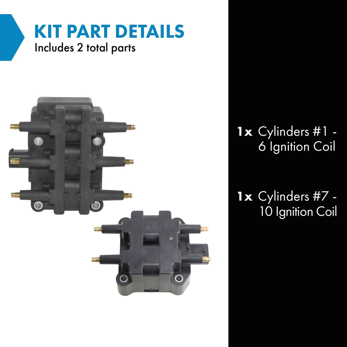 2 Piece Ignition Coil SetKit Includes(1) Cylinders #1 - 6 Ignition Coil(1) Cylinders #7 - 10 Ignition CoilFitmentCompatible with: 1994-96 Dodge Ram 2500 Truck V10 8.0LCompatible with: 1994-96 Dodge Ram 3500 Truck V10 8.0LProduct AttributesQuantity: 2 PieceIgnition Coil Color: BlackIgnition Coil Type: Direct ReplacementProduct Features High dielectric epoxy and reinforced bobbins for extended service life Rubber, Silicone, or Phenolic Resin Shell: Prevents premature boot wear Application Specific Design: No modifications required Complete repair to restore your engine to like-new conditionItem DetailsTRQ ignition coils will have your engine running like new. TRQ ignition coils are manufactured to precise specifications using premium raw materials to optimize each vehicle's ignition system. To ensure peak performance, TRQ recommends replacing ignition coils in sets to prevent electrical output imbalances. All products are fit and road-tested in our Massachusetts R&D facility to ensure we deliver on our promise of Trusted Reliable Quality.Reference NumbersACDelco: C-531Airtex: 5C1108AutoZone: C937BWD: E66Carquest: 52-1977Chrysler: 53006565, 53006566Delphi: GN10297Echlin: IC51Hollander: 610-02790, 610-02791IMC: CLS1043Mopar: 88921318NAPA Mileage Plus: IC51SBOriginal Engine Management: 50093Standard Ignition: UF-121, UF-122Standard Motor Products: UF-121, UF121, UF122Wells: C938WPS World Power Systems: CUF121
