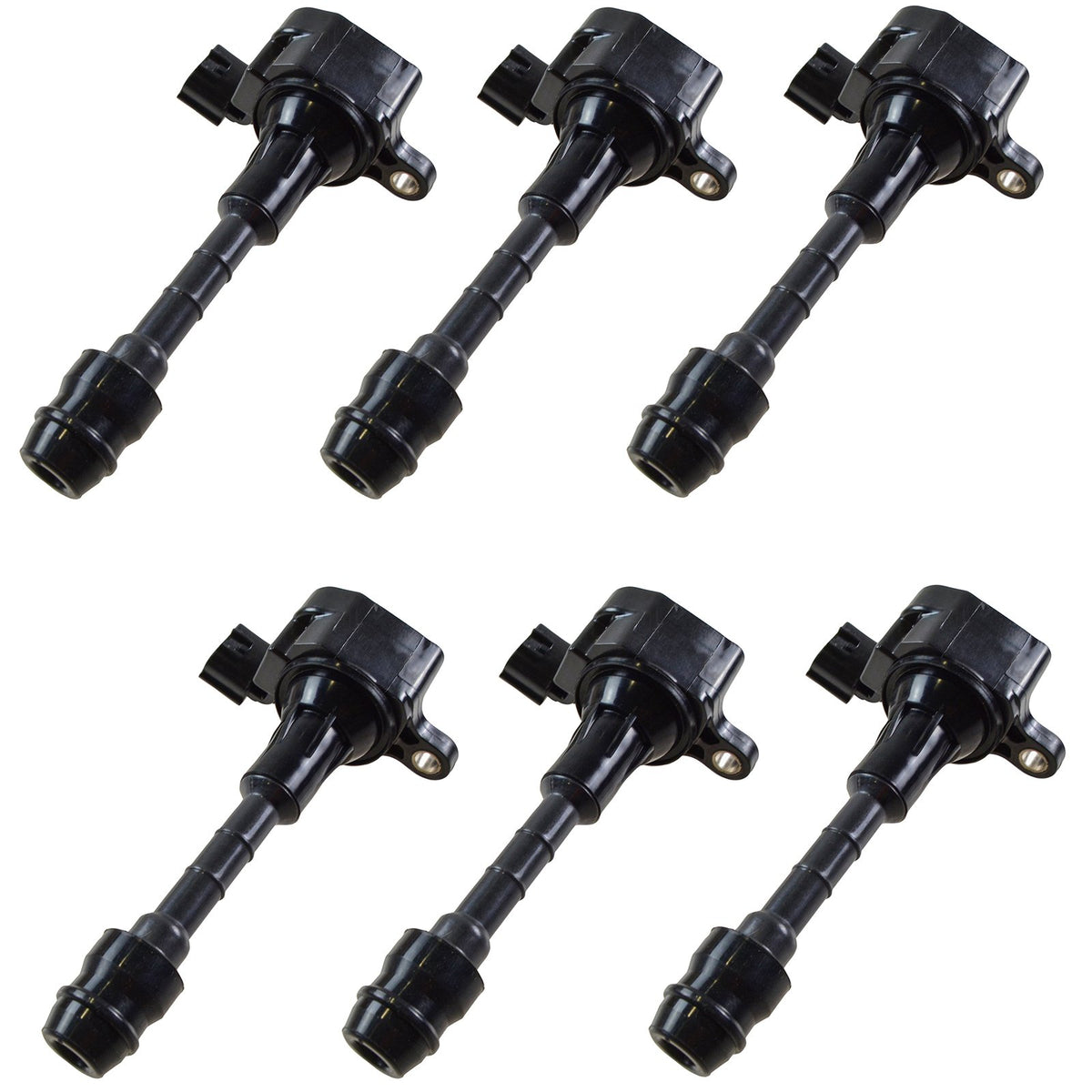6 Piece Ignition Coil SetKit Includes(6) Ignition CoilsFitmentCompatible with: 2003-06 Infiniti G35 V6 3.5LCompatible with: 2003-06 Nissan 350Z V6 3.5LCompatible with: 2003-08 Infiniti FX35 V6 3.5LCompatible with: 2006-08 Infiniti M35 V6 3.5LCompatible with: 2007 Infiniti G35 Coupe V6 3.5LProduct AttributesQuantity: 6 PieceIgnition Coil Color: BlackIgnition Coil Type: Direct ReplacementProduct Features High dielectric epoxy and reinforced bobbins for extended service life Rubber, Silicone, or Phenolic Resin Shell: Prevents premature boot wear Application Specific Design: No modifications required Complete repair to restore your engine to like-new conditionItem DetailsTRQ ignition coils will have your engine running like new. TRQ ignition coils are manufactured to precise specifications using premium raw materials to optimize each vehicle's ignition system. To ensure peak performance, TRQ recommends replacing ignition coils in sets to prevent electrical output imbalances. All products are fit and road-tested in our Massachusetts R&D facility to ensure we deliver on our promise of Trusted Reliable Quality.Reference NumbersAirtex: 5C1430Beck/Arnley: 178-8317BWD: E421Carquest: 52-1774Datsun/Nissan: 22433-AL61C, 22433AL615, 22433AL61C, 22448-AL61C, 22448AL615, 22448AL61CDelphi: GN10246DENSO Auto Parts: 673-4025Echlin: IC521Hitachi Automotive: IGC0007Hollander: 610-58649IMC: CLS1065NAPA Mileage Plus: IC521SBNGK: U5123Nissan: 22448-AL615, 22448AL615NTK: U5123Original Engine Management: 50076Richporter: C-689SMP: UF401Spectra Premium: C-689Standard Ignition: UF-401Standard Import: E421Standard Motor Products: UF-401Walker Products: 921-2078Wells: C1439WPS World Power Systems: CUF401