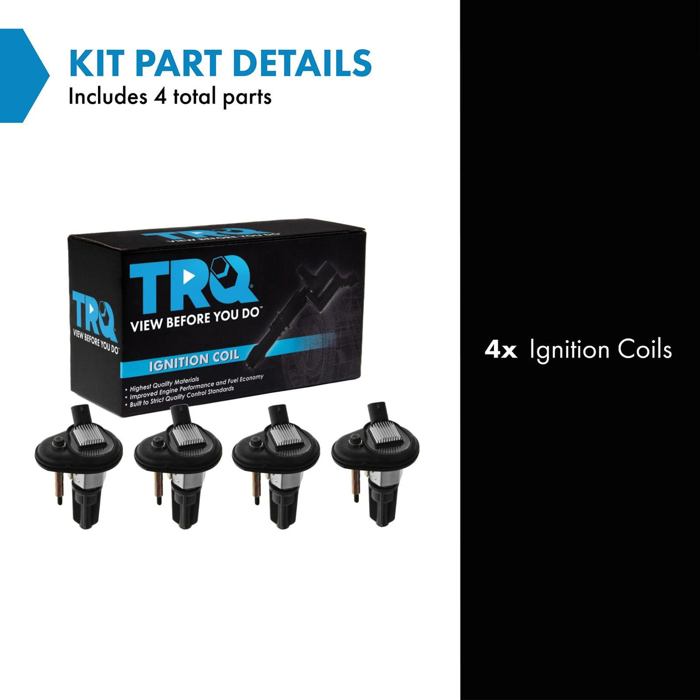 4 Piece Ignition Coil SetKit Includes(4) Ignition CoilsFitmentCompatible with: 2004-06 Chevrolet Colorado L4 2.8LCompatible with: 2004-06 GMC Canyon L4 2.8LCompatible with: 2007-08 Isuzu i-290 L4 2.9LCompatible with: 2006 Isuzu i-280 L4 2.8LProduct AttributesQuantity: 4 PieceIgnition Coil Color: BlackIgnition Coil Type: Direct ReplacementProduct Features Enhanced Efficiency: Up to 15% more energy transferred to spark plugs High Temperature Epoxy: Enhanced service life Faster rise times and duration Improved throttle responseItem DetailsTRQ ignition coils will have your engine running like new. TRQ ignition coils are manufactured to precise specifications using premium raw materials to optimize each vehicle's ignition system. To ensure peak performance, TRQ recommends replacing ignition coils in sets to prevent electrical output imbalances. All products are fit and road-tested in our Massachusetts R&D facility to ensure we deliver on our promise of Trusted Reliable Quality.Reference NumbersACDelco: 12 56 8062Advan-tech: 8Q5Airtex Engine Management: C1395Airtex: 5C1392Beck/Arnley: 178-8390, 178-8391Belden: 702423BWD: E255, E255PCarquest: 52-1743Delphi: GN10114DENSO Auto Parts: 673-7200Driveworks: 26342Echlin: IC414General Motors: 12568062, 19300921Hollander: 610-00109Isuzu: 8125680620, 8193009210NAPA Mileage Plus: IC414SBOriginal Engine Management: 50051Richporter: C-642Saab: 19300921SMP: UF303Spectra Premium: C-642Standard Ignition: UF-303Standard Motor Products: UF-303, UF303TWalker Products: 921-2003Wells: C1395WPS World Power Systems: CUF303