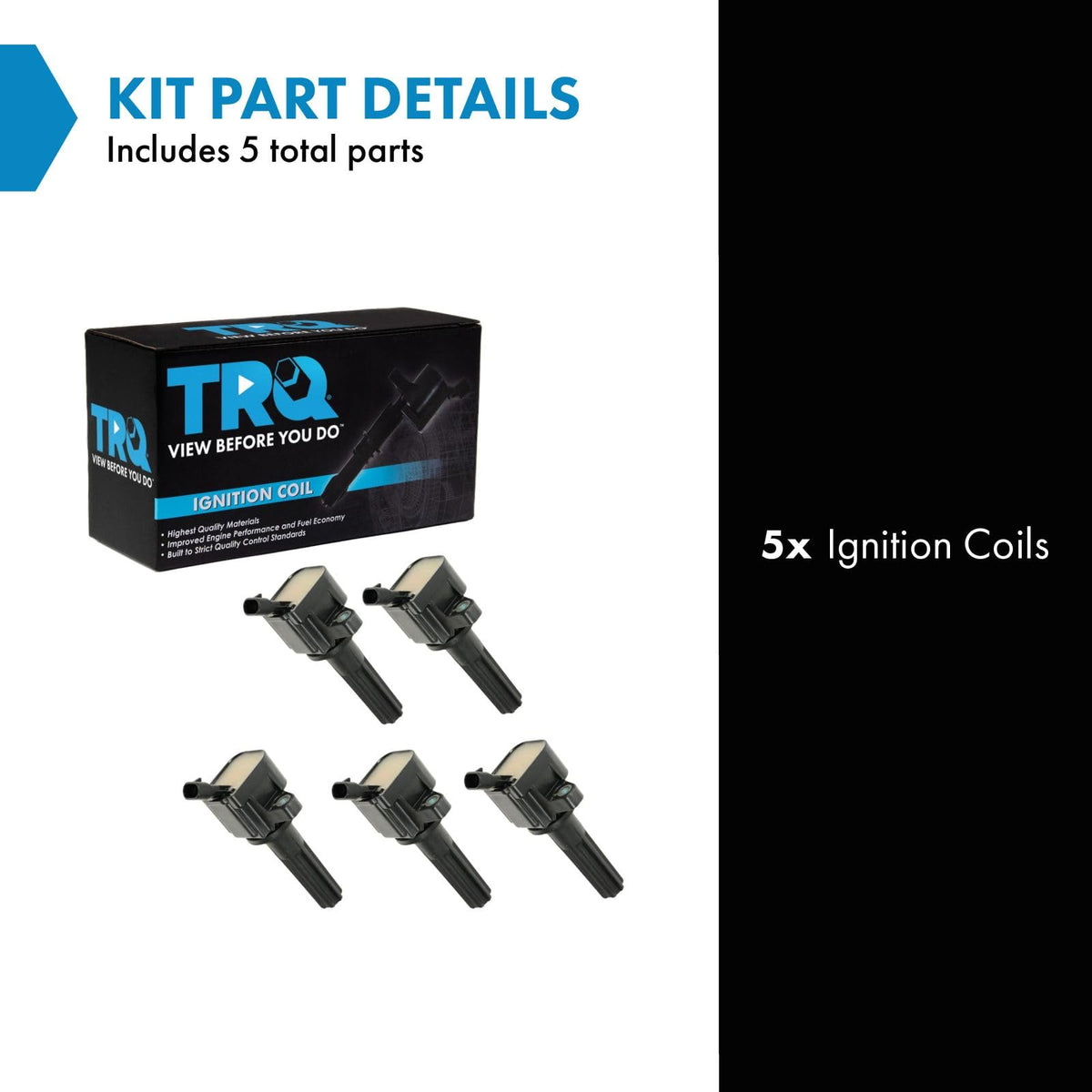 5 Piece Ignition Coil SetKit Includes(5) Ignition CoilsFitmentCompatible with: 2007-12 Chevrolet Colorado L5 3.7LCompatible with: 2007-10 Hummer H3 L5 3.7LCompatible with: 2007-12 GMC Canyon L5 3.7LCompatible with: 2009-10 Hummer H3T L5 3.7LProduct AttributesQuantity: 5 PieceIgnition Coil Color: BlackIgnition Coil Type: Direct ReplacementProduct Features Enhanced Efficiency: Up to 15% more energy transferred to spark plugs High Temperature Epoxy: Enhanced service life Faster rise times and duration Improved throttle responseItem DetailsTRQ ignition coils will have your engine running like new. TRQ ignition coils are manufactured to precise specifications using premium raw materials to optimize each vehicle's ignition system. To ensure peak performance, TRQ recommends replacing ignition coils in sets to prevent electrical output imbalances. All products are fit and road-tested in our Massachusetts R&D facility to ensure we deliver on our promise of Trusted Reliable Quality.Reference NumbersACDelco: BSC1558, D1935EAirtex: 5C1615Autopart International: 285189Beck/Arnley: 178-8471BorgWarner: E997BWD: E997Delphi: GN10454DENSO Auto Parts: 673-7003Echlin: IC577General Motors: 12596547, 12629472Hollander: 610-02868Isuzu: 8126294720NAPA Mileage Plus: IC577SBSMP: UF497Spectra Premium: C-741Standard Ignition: UF-497Standard Motor Products: UF-497Walker Products: 921-2091Wells: C1558