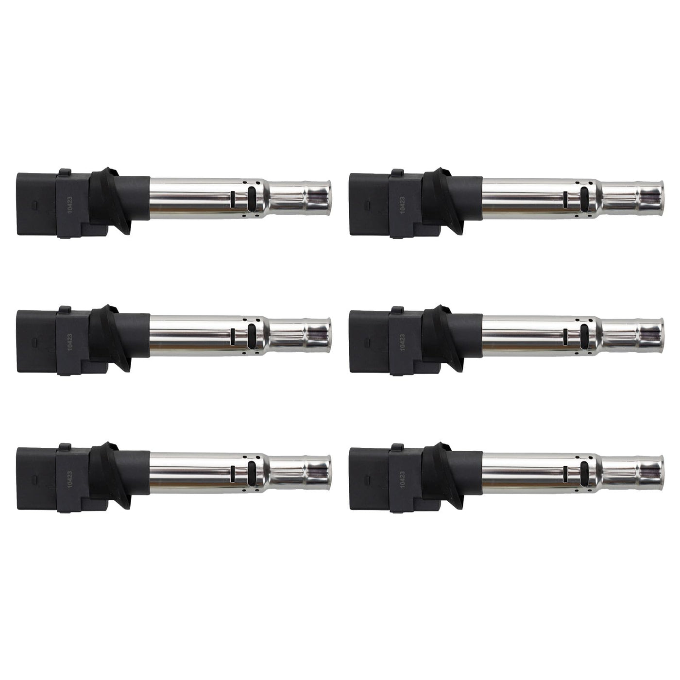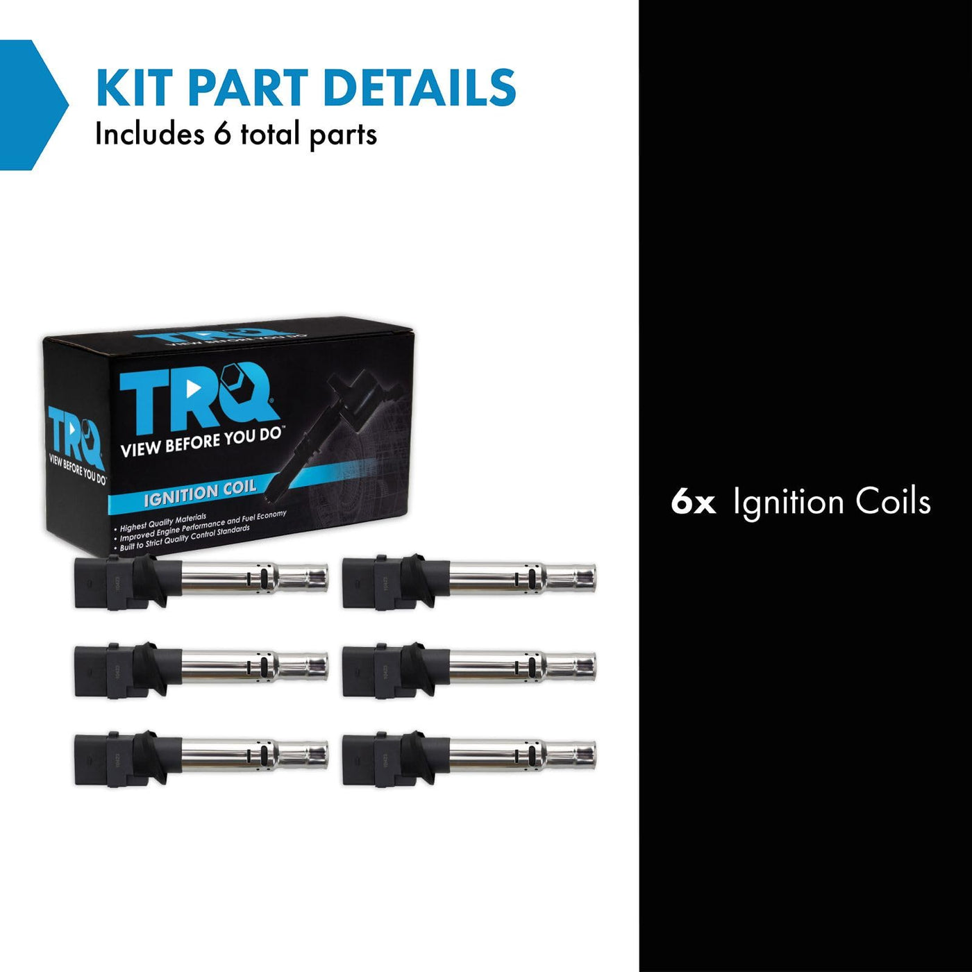 6 Piece Ignition Coil SetKit Includes(6) Ignition CoilsFitmentCompatible with: 2012-18 VW Passat V6 3.6LCompatible with: 2018-20 VW Atlas V6 3.6LCompatible with: 2009-16 VW CC V6 3.6LCompatible with: 2009-17 VW Touareg V6 3.6LCompatible with: 2009-10 Audi Q7 V6 3.6LProduct AttributesQuantity: 6 PieceIgnition Coil Color: BlackIgnition Coil Type: Direct ReplacementProduct Features High dielectric epoxy and reinforced bobbins for extended service life Rubber, Silicone, or Phenolic Resin Shell: Prevents premature boot wear Application Specific Design: No modifications required Complete repair to restore your engine to like-new conditionItem DetailsTRQ ignition coils will have your engine running like new. TRQ ignition coils are manufactured to precise specifications using premium raw materials to optimize each vehicle's ignition system. To ensure peak performance, TRQ recommends replacing ignition coils in sets to prevent electrical output imbalances. All products are fit and road-tested in our Massachusetts R&D facility to ensure we deliver on our promise of Trusted Reliable Quality.Reference NumbersStandard Ignition: UF-635