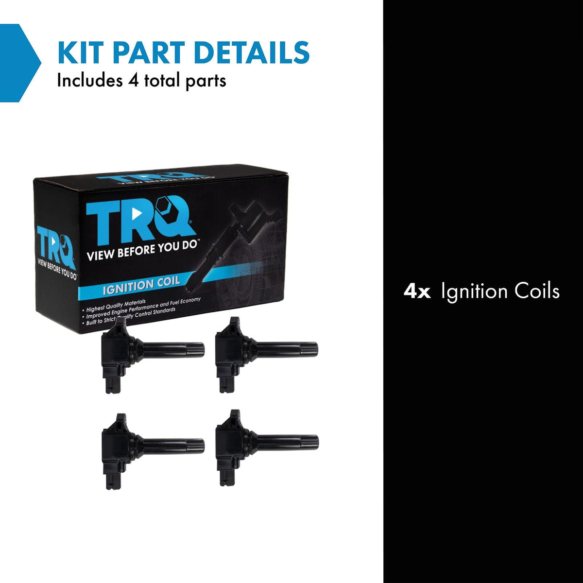 4 Piece Ignition Coil SetKit Includes(4) Ignition CoilsFitmentCompatible with: 2015-19 Subaru Outback H4 2.5LCompatible with: 2017-18 Subaru Forester H4 2.5LCompatible with: 2017-18 Subaru Forester H4 2.0LCompatible with: 2015-19 Subaru Legacy H4 2.5LCompatible with: 2016-17 Subaru Crosstrek H4 2.0LCompatible with: 2015-20 Subaru WRX H4 2.0LCompatible with: 2015 Subaru XV Crosstrek H4 2.0LCompatible with: 2015-20 Subaru BRZ H4 2.0LCompatible with: 2015-16 Scion FR-S H4 2.0LCompatible with: 2017-20 Toyota 86 H4 2.0LProduct AttributesQuantity: 4 PieceIgnition Coil Color: BlackIgnition Coil Type: Direct ReplacementProduct Features Enhanced Efficiency: Up to 15% more energy transferred to spark plugs High Temperature Epoxy: Enhanced service life Faster rise times and duration Improved throttle responseItem DetailsTRQ ignition coils will have your engine running like new. TRQ ignition coils are manufactured to precise specifications using premium raw materials to optimize each vehicle's ignition system. To ensure peak performance, TRQ recommends replacing ignition coils in sets to prevent electrical output imbalances. All products are fit and road-tested in our Massachusetts R&D facility to ensure we deliver on our promise of Trusted Reliable Quality.Reference NumbersStandard Ignition: UF-747Standard Motor Products: UF774Subaru: 22433-AA700, 22433AA700