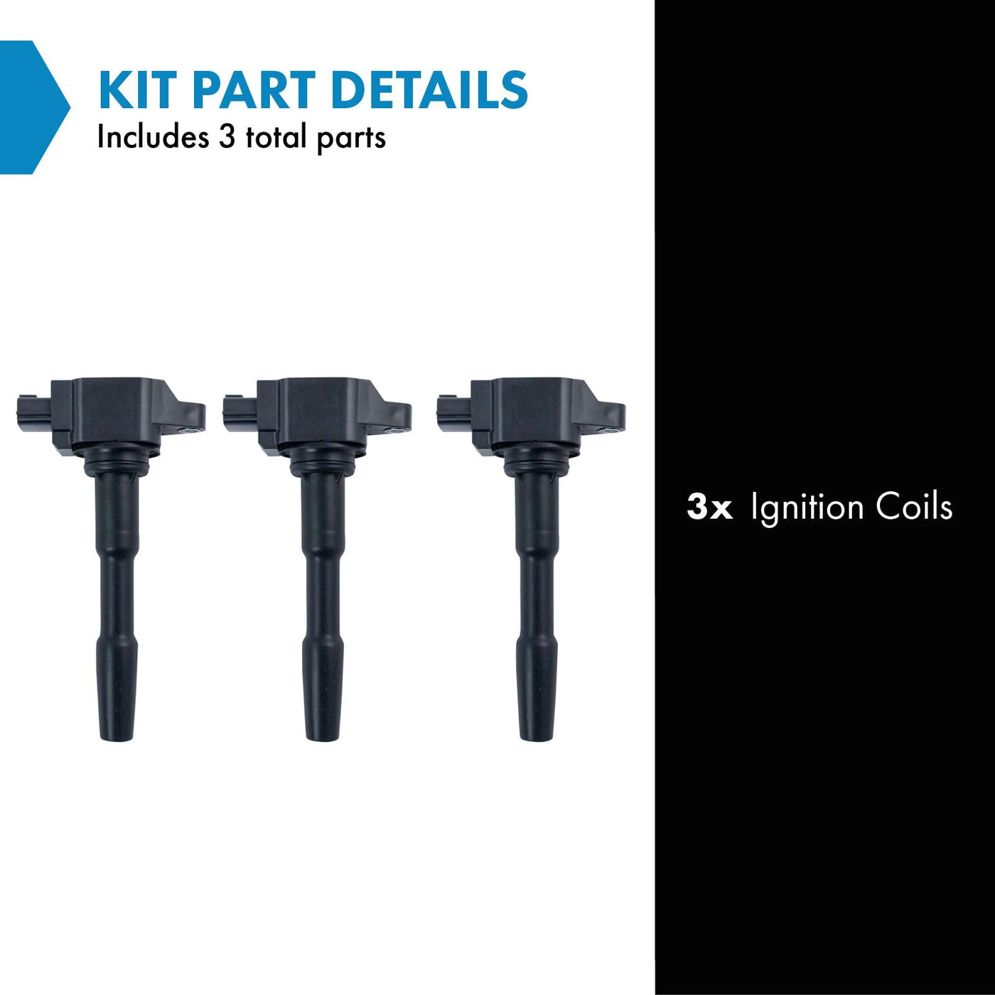 3 Piece Ignition Coil SetKit Includes(3) Ignition CoilsFitmentCompatible with: 2016-17 Smart fortwo L3 0.9LProduct AttributesQuantity: 3 PieceIgnition Coil Color: BlackIgnition Coil Type: Direct ReplacementProduct Features Enhanced Efficiency: Up to 15% more energy transferred to spark plugs High Temperature Epoxy: Enhanced service life Faster rise times and duration Improved throttle responseItem DetailsTRQ ignition coils will have your engine running like new. TRQ ignition coils are manufactured to precise specifications using premium raw materials to optimize each vehicle's ignition system. To ensure peak performance, TRQ recommends replacing ignition coils in sets to prevent electrical output imbalances. All products are fit and road-tested in our Massachusetts R&D facility to ensure we deliver on our promise of Trusted Reliable Quality.Reference NumbersDelphi Engine Management: GN10798Delphi: GN10798Mercedes-Benz: 2819060000Renault: 22433-2428RStandard Ignition: UF808Standard Import: UF808Standard Motor Products: UF808