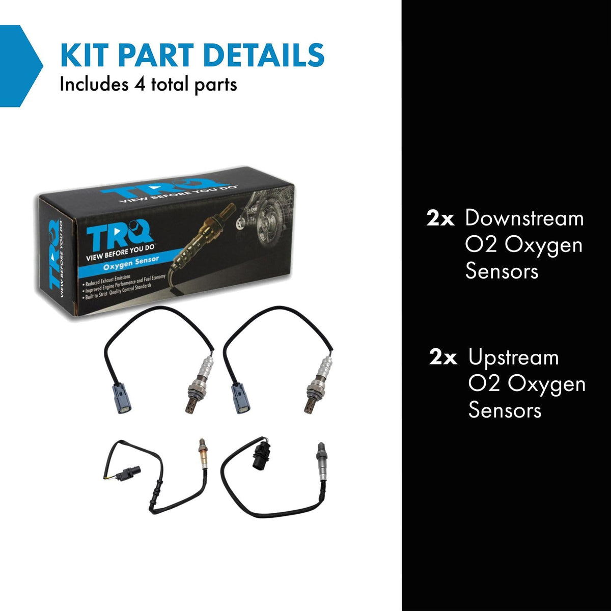4 Piece O2 Oxygen Sensor SetKit Includes(2) Downstream O2 Oxygen Sensors(2) Upstream O2 Oxygen SensorsFitmentCompatible with: 2012-14 Ford F150 Truck V8 6.2L Upstream & DownstreamCompatible with: 2012-14 Ford F150 Truck V8 5.0L Upstream & DownstreamProduct AttributesQuantity: 4 PieceProduct Features Application Specific Design: No modifications and pre-calibrated Isotatic-pressed and plasma-sprayed for extended service life Double-Layered 310S Stainless Steel: Additional protection from moisture and debris Restored Engine Performance: Improved fuel economy and lower emissionsItem DetailsTRQ oxygen sensors are manufactured to precise specifications using premium raw materials to optimize your vehicles emission system. Each sensor is isostatically-pressed for improved strength and durability, and plasma-sprayed to improve sensitivity and prolong the service life of the sensors. Oxygen sensors wear out over time and should be replaced every 60,000 miles to prevent poor engine performance. TRQ recommends replacing the oxygen sensors in sets to optimize fuel economy and reduce overall emissions. All products are fit and road-tested in our Massachusetts R&D facility to ensure we deliver on our promise of Trusted Reliable Quality.Reference NumbersACDelco: 213-4618Bosch: 0258007307, 0258007308, 17298, 17307, 17310, 17336, 17358, 18069, LS7308DENSO Auto Parts: 234-5076, 234-5113DENSO: 234-4494, 234-5107Motorcraft: BL3Z9G444APorsche: 99760612802, 99760616801VAICO: V10-76-0132VEMO: V10-76-0132Walker Products: 250-24992, 250-25035, 250-25039, 250-25049, 250-25163, 250-25168