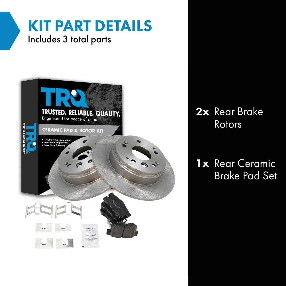 Ceramic Brake Pad & Rotor KitKit Includes(1) Rear Ceramic Brake Pad Set(2) Rear Brake RotorsFitmentCompatible with: 2003-11 Honda Element RearCompatible with: 2004-06 Acura TL V6 3.2L RearCompatible with: 2007-08 Acura TL RearProduct AttributesRear Brake Rotor Diameter: 11.10 in. (282mm)Wheel Lug Count: 5 LugBrake Pad Friction Material: CeramicBrake Pad Bonding Type: Premium PosiRear Brake Rotor Venting Type: SolidProduct Features Positive Molded - Less dust resulting in clean wheels G3000 Casting Alloy - Reduced noise and improved wear resistance Application Specific Design - Extended service life, no modificationsItem DetailsTRQ brake kits are designed to restore your brake system to like-new performance. TRQ brake pads are positive molded, thermal scorched, chamfered, and utilize a multi-layer shim for enhanced performance and service life. TRQ rotors have a non-directional finish that reduces the break-in period for new rotors as well as reducing vibrations throughout the rotors lifecycle. All products are fit and road-tested in our Massachusetts R&D facility to ensure we deliver on our promise of Trusted Reliable Quality.Reference NumbersAcura: 43022SEPA00, 43022SEPC01, 43022SP0000, 43022SP0010, 43022SP0020, 43022SP0030, 43022STKA01, 43022SV4G00, 43022SX0A50, 43022SZ3A00, 43022SZ3A01, NBKD6291EFAimco: 31316Bendix: PRT5423DuraGo: BR31316Hollander: 533-58544B, 533-59038Honda: 43022S6D000, 43022S9AA00, 43022S9AA01, 43022SCVA00, 43022SV4G00, 43022SX0A50Isuzu: 5862029840, 5862070780, 5862072040Raybestos Brakes: 980151, 980151FZN, 980151P, 980151R, EHT536H, MGD536CHWagner: BD126209