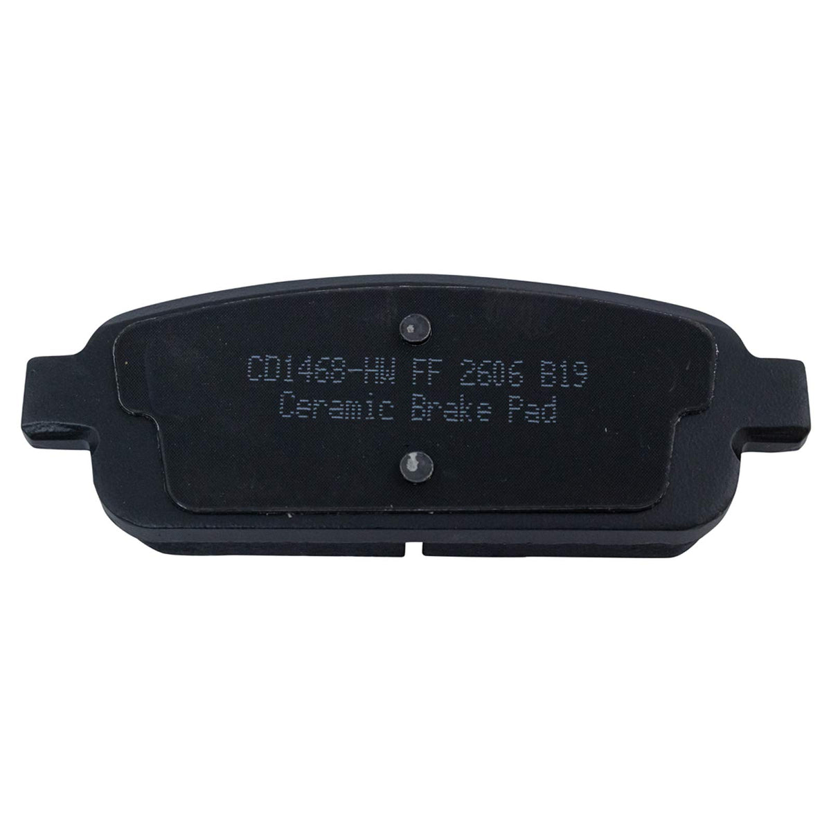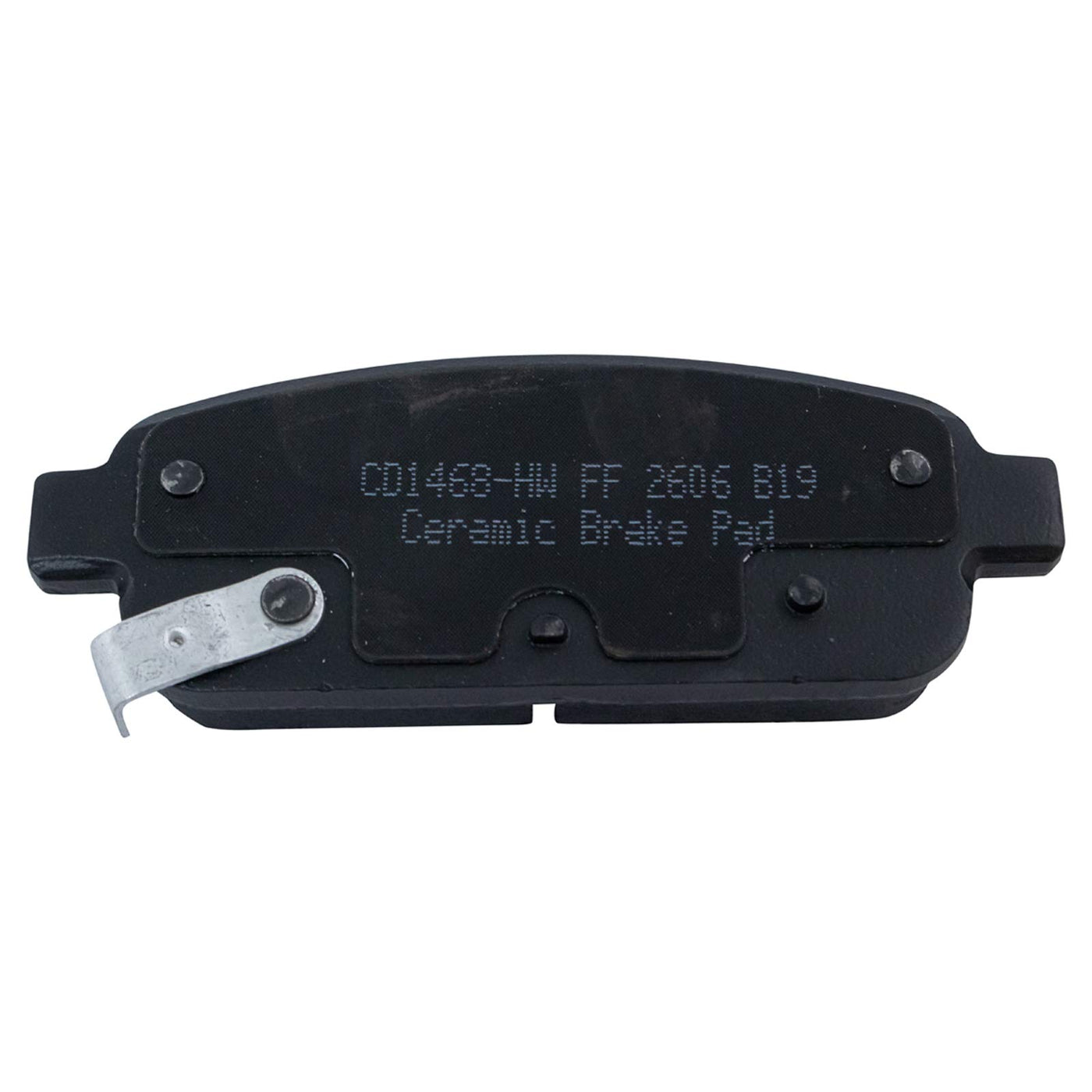Ceramic Brake PadsFitmentCompatible with: 2011-15 Chevrolet Cruze RearCompatible with: 2013-17 Buick Encore RearCompatible with: 2013-16 Chevrolet Sonic RearCompatible with: 2014-17 Chevrolet Trax RearCompatible with: 2012-17 Buick Verano RearCompatible with: 2016 Chevrolet Cruze Limited RearCompatible with: 2011-15 Chevrolet Volt RearCompatible with: 2016-19 Buick Cascada RearCompatible with: 2014-15 Cadillac ELR RearProduct AttributesInner Pad Friction Material Thickness: 0.39 inOuter Pad Friction Material Thickness: 0.39 inOuter Pad Overall Thickness: 0.63 inInner Pad Overall Thickness: 0.63 inOuter Pad Height: 1.69 inInner Pad Height: 1.69 inInner Pad Friction Material Thickness: 10 mmOuter Pad Friction Material Thickness: 10 mmOuter Pad Width: 117 mmInner Pad Width: 117 mmOuter Pad Overall Thickness: 16 mmInner Pad Overall Thickness: 16 mmPad Quantity: 4Outer Pad Width: 4.61 inInner Pad Width: 4.61 inOuter Pad Height: 43 mmInner Pad Height: 43 mmBacking Plate Color: BlackPad Shim Color: BlackFriction Material Composition: CeramicPad Shim Material: FiberFriction Material Attachment: Integrally MoldedPad Wear Sensor Type: MechanicalBetter Brakes Law SAE Environmental Compliance Level: NAbutment Clips Included: NoBolts Included: NoBacking Material: SteelWear Indicator Attached: YesPad Shims Included: YesPad Wear Sensor Included: YesChamfered Edges: YesPrepared For Pad Wear Sensor: YesFriction Surface Scorched: YesMounting Hardware Included: YesSlotted: YesBrake Lubricant Included: YesBrake Pad Friction Material: CeramicIncludes: Contact Point GreaseIncludes: HardwareBrake Pad Bonding Type: Premium PosiProduct Features Positive Molded: Less dust resulting in clean wheels Thermal Scorched: Improved stopping performance Application Specific Design: Extended service life, no modifications Hardware and grease included for a complete repair Environmentally Compliant: Meets all Better Brake Law standardsItem DetailsTRQ brake pads are manufactured using premium raw materials and design standards to restore original performance. TRQ brake pads are positive molded and utilize a multi-layer shim for enhanced performance and service life. TRQs combination of materials and design ensures a low dust and low noise braking experience. TRQ recommends replacing your brake rotors when you replace your brake pads to ensure even wear of components and improved braking comfort. All products are fit and road-tested in our Massachusetts R&D facility to ensure we deliver on our promise of Trusted Reliable Quality.Reference NumbersBuick: 13319293, 13404405, 13408579, 13411380Cadillac: 13319293, 13404405, 13417473Chevrolet: 13300868, 13319293, 13319294, 13404405, 13408579Raybestos Brakes: EHT1468H, MGD1468CH, SGD1468C