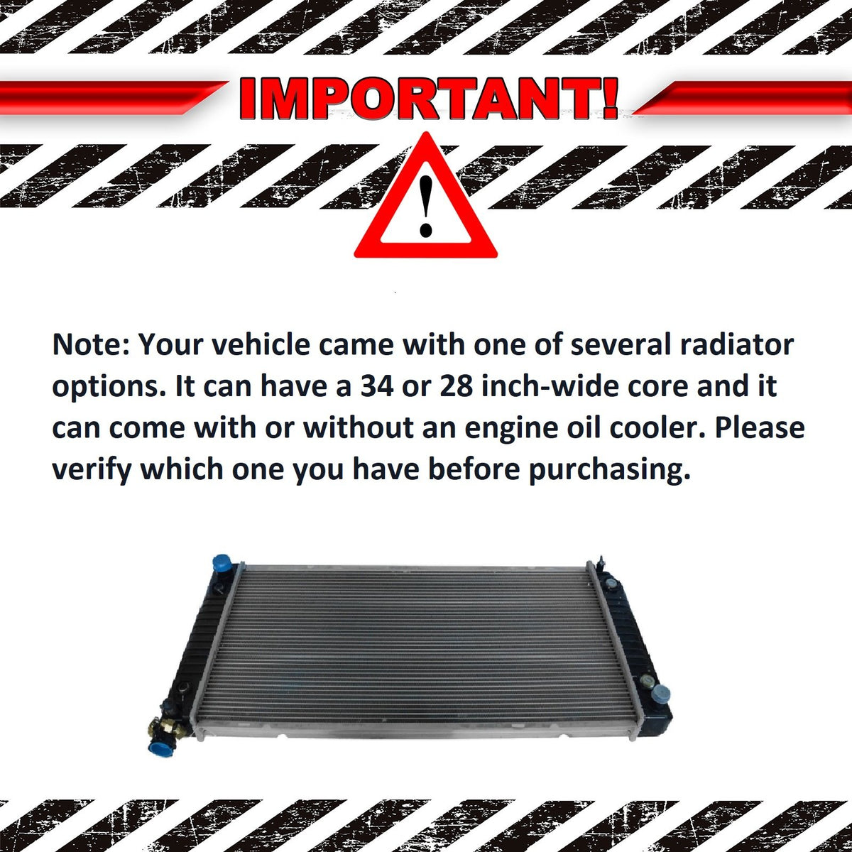 RadiatorFitmentCompatible with: 1994-98 Chevrolet K1500 Truck V8 5.7L with 34 Inch Core with Engine Oil CoolerCompatible with: 1994-98 Chevrolet C1500 Truck V8 5.7L with 34 Inch Core with Engine Oil CoolerCompatible with: 1996-98 Chevrolet K1500 Truck V8 5.0L with 34 Inch Core with Engine Oil CoolerCompatible with: 1996-98 Chevrolet C1500 Truck V8 5.0L with 34 Inch Core with Engine Oil CoolerCompatible with: 1995-00 Chevrolet Tahoe V8 5.7L with 34 Inch Core with Engine Oil CoolerCompatible with: 1994-98 GMC C1500 Truck V8 5.7L with 34 Inch Core with Engine Oil CoolerCompatible with: 1994-98 GMC K1500 Truck V8 5.7L with 34 Inch Core with Engine Oil CoolerCompatible with: 1994-00 Chevrolet K2500 Truck V8 5.7L with 34 Inch Core with Engine Oil CoolerCompatible with: 1994-99 Chevrolet Suburban K1500 V8 5.7L with 34 Inch Core with Engine Oil CoolerCompatible with: 1996-98 GMC C1500 Truck V8 5.0L with 34 Inch Core with Engine Oil CoolerCompatible with: 1994-00 Chevrolet K3500 Truck V8 5.7L with 34 Inch Core with Engine Oil CoolerCompatible with: 1996-98 GMC K1500 Truck V8 5.0L with 34 Inch Core with Engine Oil CoolerCompatible with: 1994-00 Chevrolet C2500 Truck V8 5.7L with 34 Inch Core with Engine Oil CoolerCompatible with: 1994-00 Chevrolet C3500 Truck V8 5.7L with 34 Inch Core with Engine Oil CoolerCompatible with: 1994-99 Chevrolet Suburban C1500 V8 5.7L with 34 Inch Core with Engine Oil CoolerCompatible with: 1996-99 Chevrolet C2500 Truck V8 5.0L with 34 Inch Core with Engine Oil CoolerCompatible with: 1994-00 GMC K2500 Truck V8 5.7L with 34 Inch Core with Engine Oil CoolerCompatible with: 1998-99 GMC Yukon with 34 Inch Core with Engine Oil CoolerCompatible with: 1995-99 GMC Suburban K1500 V8 5.7L with 34 Inch Core with Engine Oil CoolerCompatible with: 1994-97 GMC Yukon V8 5.7L with 34 Inch Core with Engine Oil CoolerCompatible with: 1994-00 GMC K3500 Truck V8 5.7L with 34 Inch Core with Engine Oil CoolerCompatible with: 1998 Chevrolet K2500 Truck V8 5.0L with 34 Inch Core with Engine Oil CoolerCompatible with: 1994-99 Chevrolet Suburban K2500 V8 5.7L with 34 Inch Core with Engine Oil CoolerCompatible with: 1994-00 GMC C2500 Truck V8 5.7L with 34 Inch Core with Engine Oil CoolerCompatible with: 2000 GMC Yukon V8 5.7L with 34 Inch Core with Engine Oil CoolerCompatible with: 1999-00 Cadillac Escalade with 34 Inch Core with Engine Oil CoolerCompatible with: 1994-00 GMC C3500 Truck V8 5.7L with 34 Inch Core with Engine Oil CoolerCompatible with: 1995-99 GMC Suburban C1500 V8 5.7L with 34 Inch Core with Engine Oil CoolerCompatible with: 1996-99 GMC C2500 Truck V8 5.0L with 34 Inch Core with Engine Oil CoolerCompatible with: 1999 Chevrolet K1500 Truck with 34 Inch Core with Engine Oil CoolerCompatible with: 1994-99 GMC Suburban K2500 V8 5.7L with 34 Inch Core with Engine Oil CoolerCompatible with: 1992-93 Chevrolet Blazer with 34 Inch Core with Engine Oil CoolerCompatible with: 1998 GMC K2500 Truck V8 5.0L with 34 Inch Core with Engine Oil CoolerCompatible with: 1994 Chevrolet Blazer V8 5.7L with 34 Inch Core with Engine Oil CoolerCompatible with: 1994-99 Chevrolet Suburban C2500 V8 5.7L with 34 Inch Core with Engine Oil CoolerCompatible with: 1999 Chevrolet C1500 Truck with 34 Inch Core with Engine Oil CoolerCompatible with: 1999 GMC K1500 Truck with 34 Inch Core with Engine Oil CoolerCompatible with: 1994 GMC Suburban K1500 with 34 Inch Core with Engine Oil CoolerCompatible with: 1994-99 GMC Suburban C2500 V8 5.7L with 34 Inch Core with Engine Oil CoolerCompatible with: 1999 GMC C1500 Truck with 34 Inch Core with Engine Oil CoolerCompatible with: 1994 GMC Suburban C1500 with 34 Inch Core with Engine Oil CoolerProduct AttributesCore Row Quantity: 1Core Thickness: 1.25 inInlet Diameter: 1.31 inOutlet Diameter: 1.56 inEngine Oil Cooler Diameter: 1.57 inCore Height: 17.25 inCore Width: 34 inEngine Oil Cooler Number of Plates: 5Transmission Oil Cooler Plate Quantity: 6Core Material: AluminumOutlet Location: Bottom RightDown Flow Or Cross Flow Type: Cross FlowMounting Type: Left & RightRadiator Cap Included: NoTank Material: PlasticTransmission Oil Cooler Type: PlatedEngine Oil Cooler Type: PlatedInlet Location: Top LeftTransmission Oil Cooler Included: YesEngine Oil Cooler Included: YesInternal Engine Oil Cooler: YesInternal Transmission Oil Cooler: YesItem DetailsDirect Fit Replacement Core thickness equal to the OE part. If radiator core is slightly thinner than the OEM, this can decrease overall performance and lifespan. Premium Aluminum Core Engineered for top performance. Provides efficient cooling and heat-transfer. 100% Leak Tested Built to strict quality control standards.Reference NumbersAgility Autoparts: 8011522APDI: 8011522Cadillac: 20586, 20587, 20734, 20744, 20753, 20759, 3058779, 42465841, 52458208, 52458845, 52458924, 52458925, 52458927, 52458928, 52459535, 52465838, 52465839, 52465840, 52465841, 52467218, 52467219, 52467234,