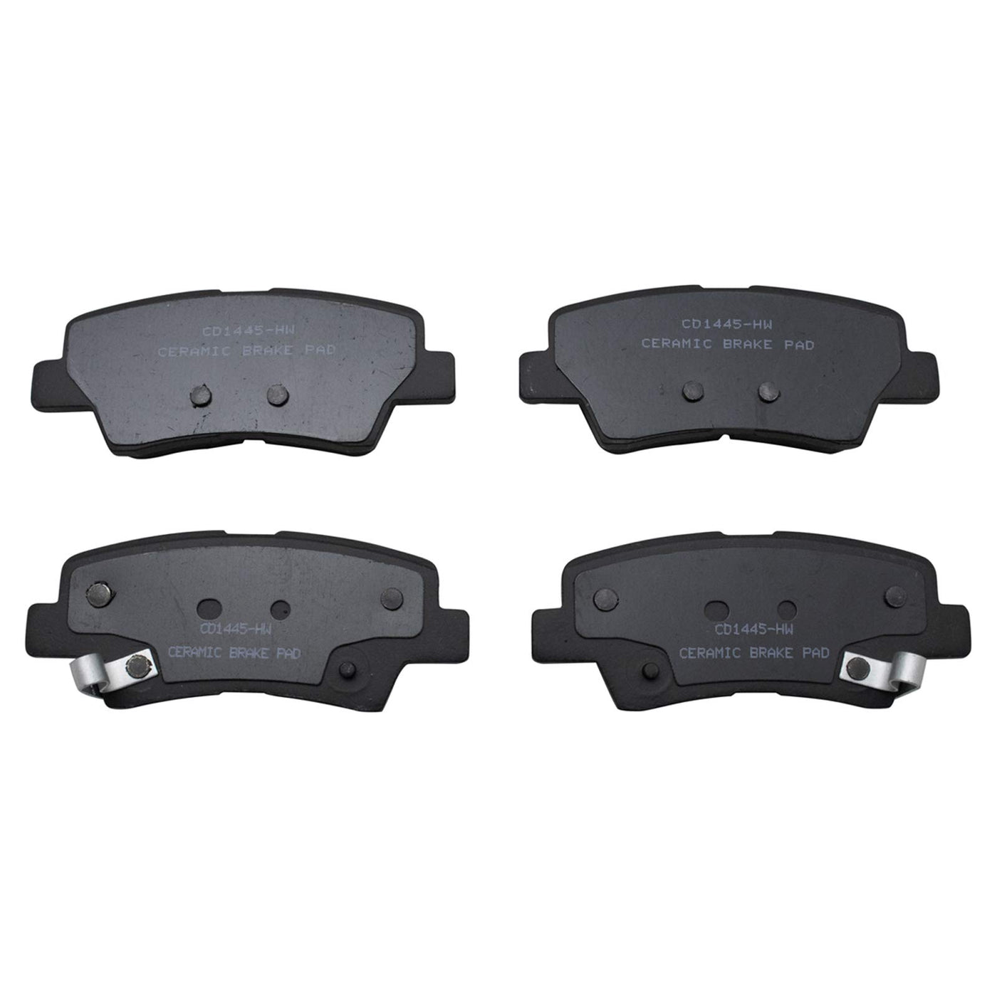Ceramic Brake PadsFitmentCompatible with: 2011-14 Hyundai Sonata RearCompatible with: 2013-16 Hyundai Elantra RearCompatible with: 2011-15 Kia Optima RearCompatible with: 2014-16 Kia Soul RearCompatible with: 2014-18 Kia Forte RearCompatible with: 2012-17 Hyundai Accent RearCompatible with: 2015 Hyundai Sonata with Power Parking Brake RearCompatible with: 2011-12 Hyundai Elantra GLS RearCompatible with: 2011-12 Hyundai Elantra Limited RearCompatible with: 2012-17 Kia Rio RearCompatible with: 2016 Kia Optima Hybrid RearCompatible with: 2016 Kia Optima Hybrid EX RearCompatible with: 2012-15 Hyundai Veloster RearCompatible with: 2013-16 Hyundai Elantra GT RearCompatible with: 2014-18 Kia Forte5 RearCompatible with: 2012-16 Hyundai Azera RearCompatible with: 2014-16 Kia Cadenza with Power Parking Brake RearCompatible with: 2013-14 Hyundai Elantra Coupe RearCompatible with: 2014-16 Kia Forte Koup RearCompatible with: 2017 Hyundai Azera Base Model RearCompatible with: 2015 Kia Soul EV RearProduct AttributesInner Pad Friction Material Thickness: 0.55 inOuter Pad Friction Material Thickness: 0.55 inOuter Pad Overall Thickness: 0.59 inInner Pad Overall Thickness: 0.59 inOuter Pad Width: 1.61 inInner Pad Width: 1.61 inOuter Pad Height: 100 mmInner Pad Height: 100 mmOuter Pad Friction Material Thickness: 14 mmInner Pad Friction Material Thickness: 14 mmOuter Pad Overall Thickness: 15 mmInner Pad Overall Thickness: 15 mmOuter Pad Height: 3.94 inInner Pad Height: 3.94 inPad Quantity: 4Outer Pad Width: 41 mmInner Pad Width: 41 mmBacking Plate Color: BlackPad Shim Color: BlackFriction Material Attachment: BondedFriction Material Composition: CeramicPad Wear Sensor Type: MechanicalBetter Brakes Law SAE Environmental Compliance Level: NBolts Included: NoECE-R90 Certified: NoMounting Hardware Included: NoFriction Surface Scorched: NoPad Shim Material: R-S-RGrade Type: RegularBacking Material: SteelSlotted: YesBrake Lubricant Included: YesChamfered Edges: YesPrepared For Pad Wear Sensor: YesAbutment Clips Included: YesWear Indicator Attached: YesPad Shims Included: YesPad Wear Sensor Included: YesBrake Pad Friction Material: CeramicIncludes: Contact Point GreaseIncludes: HardwareBrake Pad Bonding Type: Premium PosiProduct Features Positive Molded: Less dust resulting in clean wheels Thermal Scorched: Improved stopping performance Application Specific Design: Extended service life, no modifications Hardware and grease included for a complete repair Environmentally Compliant: Meets all Better Brake Law standardsItem DetailsTRQ brake pads are manufactured using premium raw materials and design standards to restore original performance. TRQ brake pads are positive molded and utilize a multi-layer shim for enhanced performance and service life. TRQs combination of materials and design ensures a low dust and low noise braking experience. TRQ recommends replacing your brake rotors when you replace your brake pads to ensure even wear of components and improved braking comfort. All products are fit and road-tested in our Massachusetts R&D facility to ensure we deliver on our promise of Trusted Reliable Quality.Reference NumbersHyundai: 583022TA60, 583022VA30, 583023QA10, 58302A5B30, 58302C1A50Kia: 583022TA60, 583023QA10, 583023RA70, 58302A7B30, 58302B2A00, 58302B2A10, 58302E4A00Raybestos Brakes: EHT1445H, MGD1445CH, SGD1445C