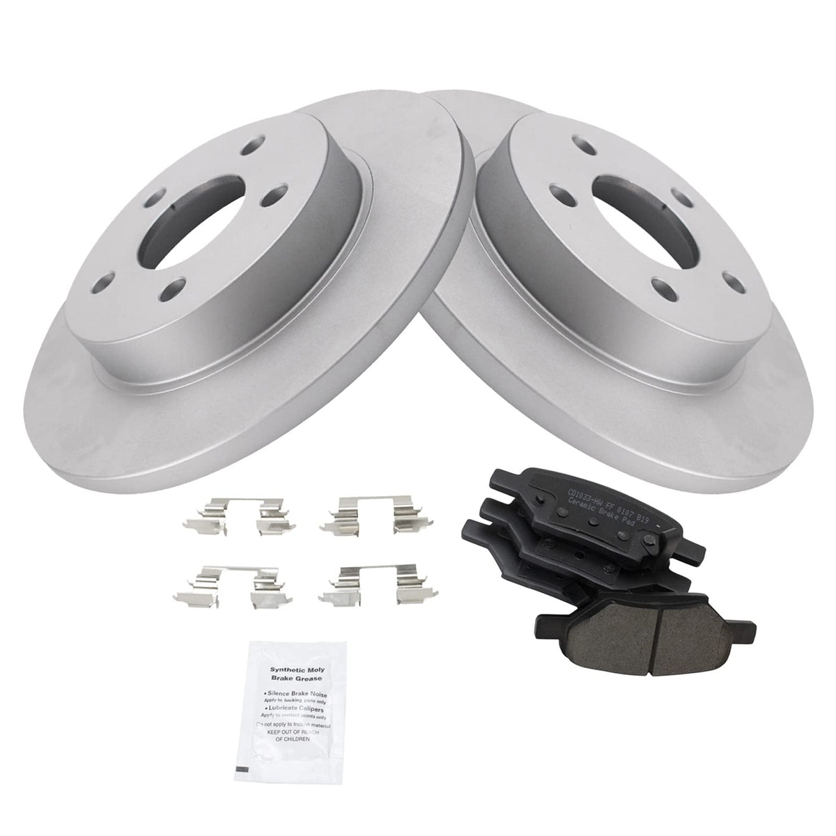 Ceramic Brake Pad & Rotor KitKit Includes(1) Rear Ceramic Brake Pad Set(2) Rear Premium G-Coated Brake RotorsFitmentCompatible with: 2004-12 Chevrolet Malibu Rear Ceramic Premium G-Coated Brake Pad & Rotor KitCompatible with: 2005-10 Pontiac G6 Rear Ceramic Premium G-Coated Brake Pad & Rotor KitCompatible with: 2005-07 Chevrolet Cobalt SS Rear Ceramic Premium G-Coated Brake Pad & Rotor KitCompatible with: 2008-10 Chevrolet HHR Rear Ceramic Premium G-Coated Brake Pad & Rotor KitCompatible with: 2004-07 Saturn Ion Red Line Rear Ceramic Premium G-Coated Brake Pad & Rotor KitCompatible with: 2007-09 Saturn Aura Rear Ceramic Premium G-Coated Brake Pad & Rotor KitCompatible with: 2007-09 Pontiac G5 Rear Ceramic Premium G-Coated Brake Pad & Rotor KitProduct AttributesRear Brake Rotor Diameter: 10.63 in. (270mm)Wheel Lug Count: 5 LugBrake Pad Friction Material: CeramicBrake Rotor Coating: Premium G-CoatedBrake Pad Bonding Type: Premium PosiRear Brake Rotor Venting Type: SolidProduct Features Positive Molded: Less dust resulting in clean wheels Electrostatic Coated: Long-lasting rust protection G3000 Casting Alloy: Reduced noise and improved wear resistance Application Specific Design: Extended service life, no modificationsItem DetailsTRQ brake kits are designed to restore your brake system to like-new performance. TRQ brake pads are positive molded, thermal scorched, chamfered, and utilize a multi-layer shim for enhanced performance and service life. TRQ G-coated rotors have long-lasting rust prevention, perfect for wheels with large openings that expose the rotor and rotor hat during daily drives. All products are fit and road-tested in our Massachusetts R&D facility to ensure we deliver on our promise of Trusted Reliable Quality.Reference NumbersChevrolet: 10365723, 15243254Pontiac: 10365723, 15243254Raybestos Brakes: EHT1033H, MGD1033CH, SGD1033CSaturn: 10365723, 15243254