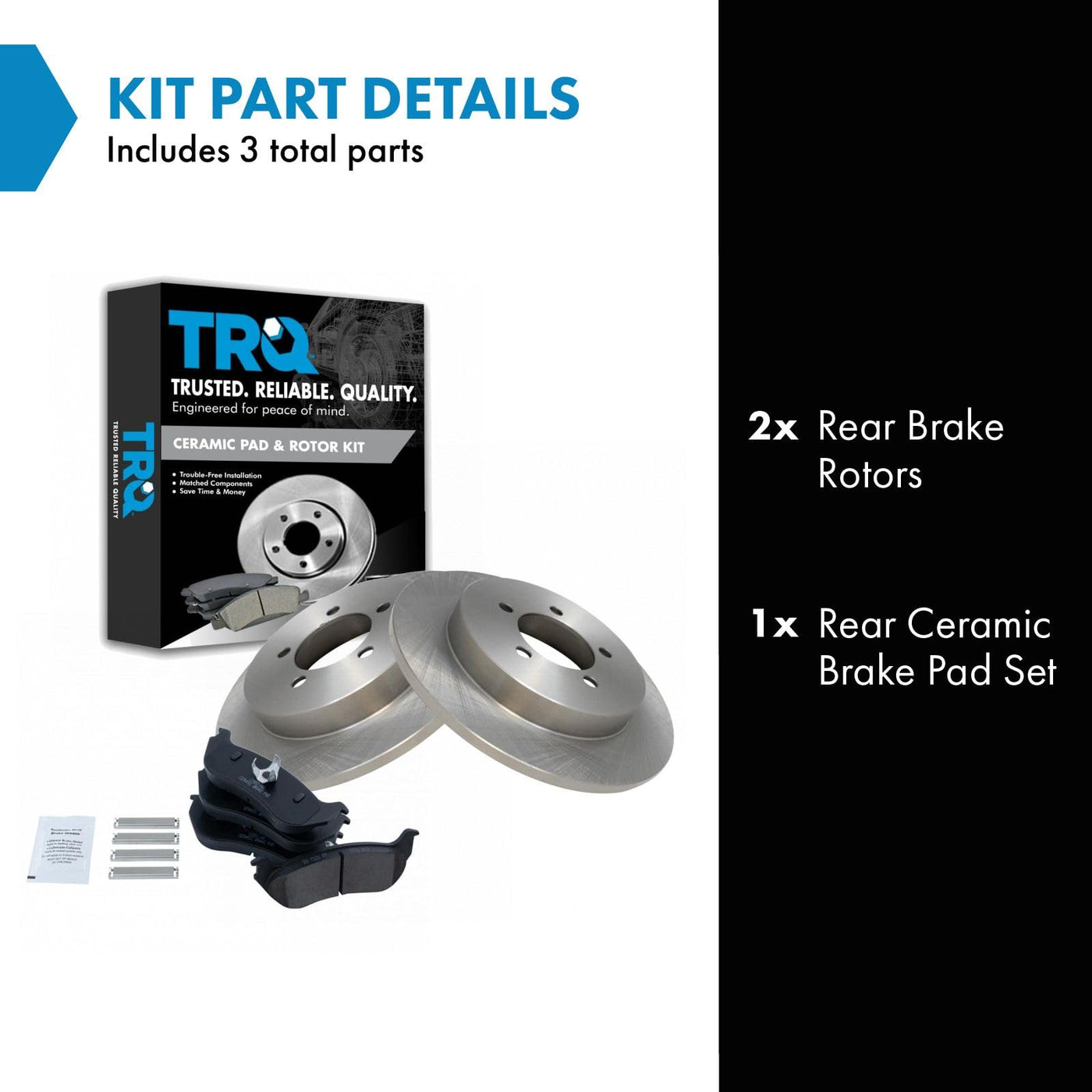 Ceramic Brake Pad & Rotor KitKit Includes(1) Rear Ceramic Brake Pad Set(2) Rear Brake RotorsFitmentCompatible with: 2002-05 Ford Explorer RearCompatible with: 2002-05 Mercury Mountaineer RearProduct AttributesBrake Pad Friction Material: CeramicBrake Pad Bonding Type: Premium PosiProduct Features Positive Molded - Less dust resulting in clean wheels G3000 Casting Alloy - Reduced noise and improved wear resistance Application Specific Design - Extended service life, no modificationsItem DetailsTRQ brake kits are designed to restore your brake system to like-new performance. TRQ brake pads are positive molded, thermal scorched, chamfered, and utilize a multi-layer shim for enhanced performance and service life. TRQ rotors have a non-directional finish that reduces the break-in period for new rotors as well as reducing vibrations throughout the rotors lifecycle. All products are fit and road-tested in our Massachusetts R&D facility to ensure we deliver on our promise of Trusted Reliable Quality.Reference NumbersAimco: 54098Bendix: PRT5358DuraGo: BR54098Ford: 3L2Z2200BAHollander: 533-02421, 533-02490Mercury: 3L2Z2200BARaybestos Brakes: 680026, 680026FZN, 680026P, 680026PER, 680026R, EHT881H, MGD881CH, SGD881CWagner: BD125759