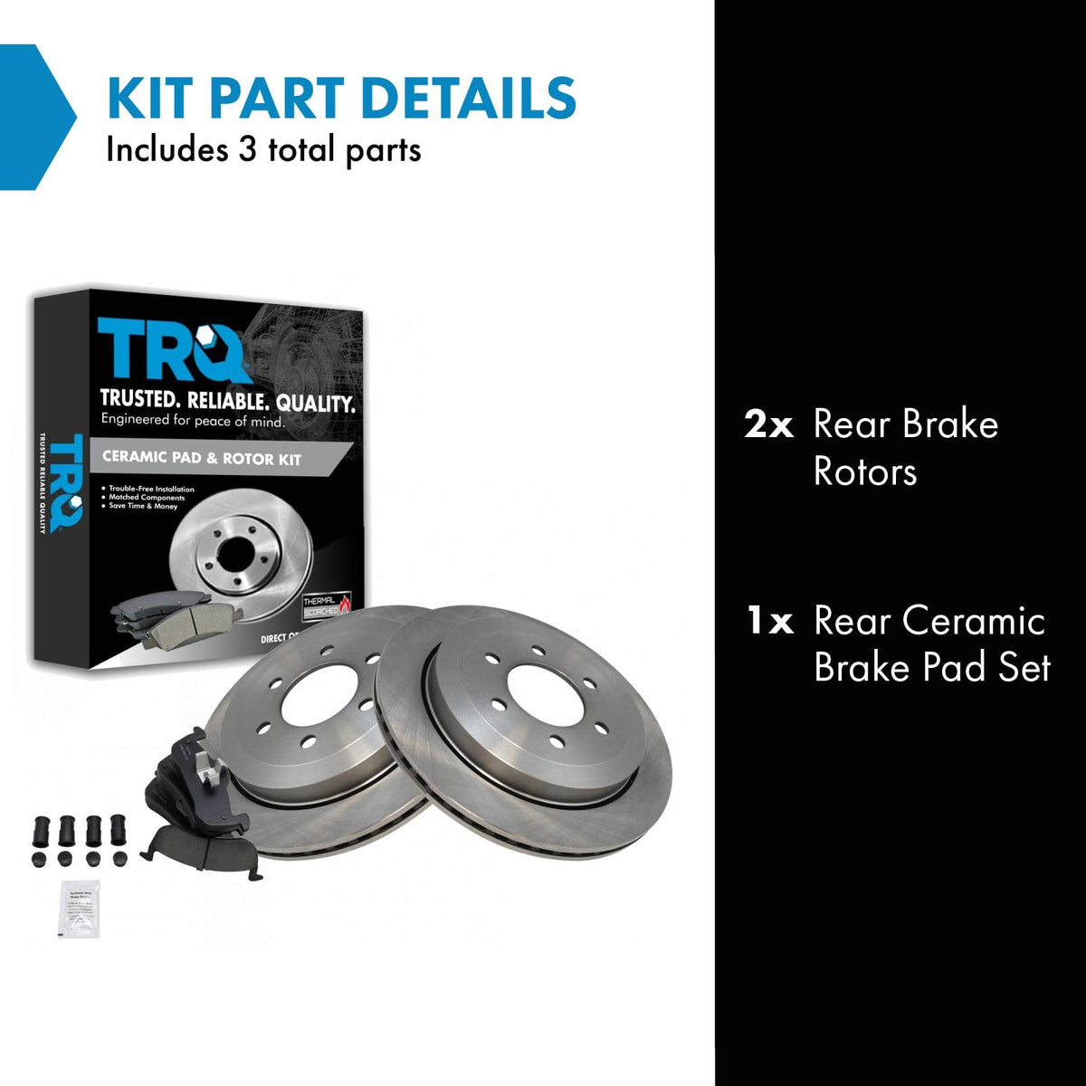 Ceramic Brake Pad & Rotor KitKit Includes(1) Rear Ceramic Brake Pad Set(2) Rear Brake RotorsFitmentCompatible with: 2007-17 Ford Expedition RearCompatible with: 2007-17 Lincoln Navigator RearProduct AttributesRear Brake Rotor Diameter: 13.46 in. (342mm)Wheel Lug Count: 6 LugBrake Pad Friction Material: CeramicBrake Pad Bonding Type: Premium PosiRear Brake Rotor Venting Type: VentedProduct Features Positive Molded - Less dust resulting in clean wheels G3000 Casting Alloy - Reduced noise and improved wear resistance Application Specific Design - Extended service life, no modificationsItem DetailsTRQ brake kits are designed to restore your brake system to like-new performance. TRQ brake pads are positive molded, thermal scorched, chamfered, and utilize a multi-layer shim for enhanced performance and service life. TRQ rotors have a non-directional finish that reduces the break-in period for new rotors as well as reducing vibrations throughout the rotors lifecycle. All products are fit and road-tested in our Massachusetts R&D facility to ensure we deliver on our promise of Trusted Reliable Quality.Reference NumbersAimco: 54152Bendix: PRT5699DuraGo: BR900366Ford: 7L1Z2200A, 7L1Z2200B, BL1Z2200A, CL1Z2200AHollander: 533-00115Lincoln: 7L1Z2200A, 7L1Z2200B, BL1Z2200A, CL1Z2200ARaybestos Brakes: 680507, 680507FZN, 680507P, 680507PER, 680507R, EHT1279Wagner: BD126431