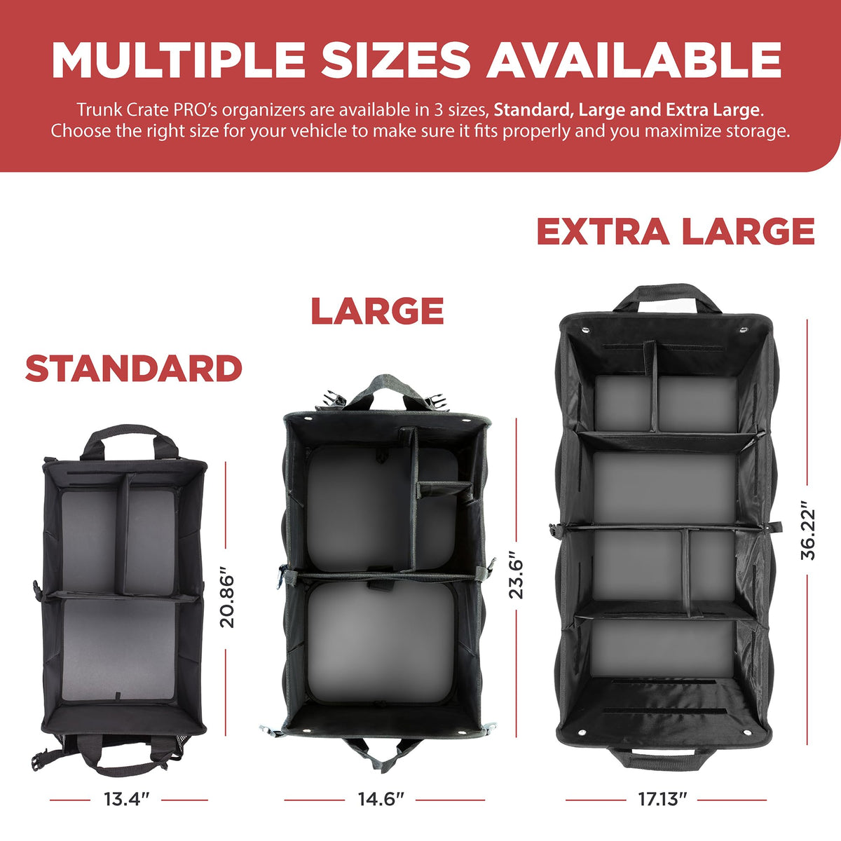 Q: What are the dimensions of the TRUNKCRATEPRO Car Trunk Organizer?A: When fully open, the TRUNKCRATEPRO measures 23.6 inches in length, 14.6 inches in width, and 12.5 inches in height. When folded in half, its dimensions are 14.6 inches by 12.25 inches by 1.5 inches, making it a versatile option for different storage needs.