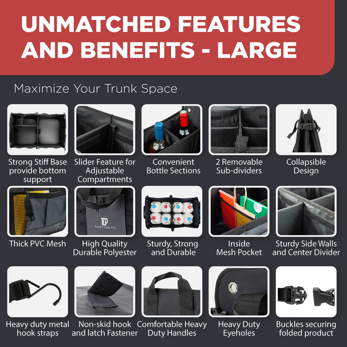 Trunkcratepro Trunk Organizer For Car, Suv, Truck | Premium Adjustable Multi Compartments Collapsible Car Trunk Organizer With S