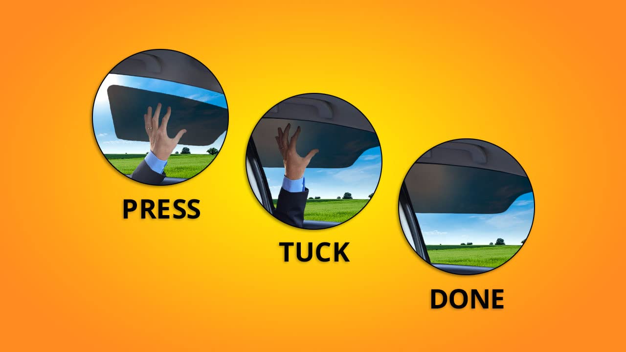 To use: Simply PRESS FLAT against window, SLIDE and TUCK into position. TuckVisor is held firmly tucked between window and trim.