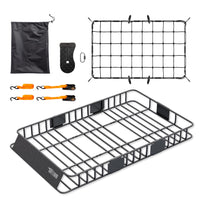 ?Extension Basket Design? Removable extension part design, you can choose whether to install expansion part according to adapt to the size of your car. 2 basket sizes available in (39''x64''x6'') or (39''x43''x6''). | ?Sturdy Steel Construction?Built with heavy-duty tubular steel for high strength and anti-scratch. Finished with black powder coating ensures long-lasting corrosion resistance and boasts an load capacity of up to 500 lbs | ?Extra Large Capacity?Equipped with a strong resilient net for securing the luggage to prevent accidental dropout during transportation.Upgrade basket heigh design for more safe and spce to storage luggage. | ?Enhanced Security?Features a wind shield forward protect cargo from wind damage and reducing wind resistance. Sturdy bottom that can keep your items secure during traveling | ?Widely Used?It is adaptable to most car SUV van or truck with cross bars up to 3.25'' wide x 1.38'' thick or round bars up to 1.8'' in diameter.Universal U-bolts included; suitable for all occasions such as camping, road trips, move home or evacuation.