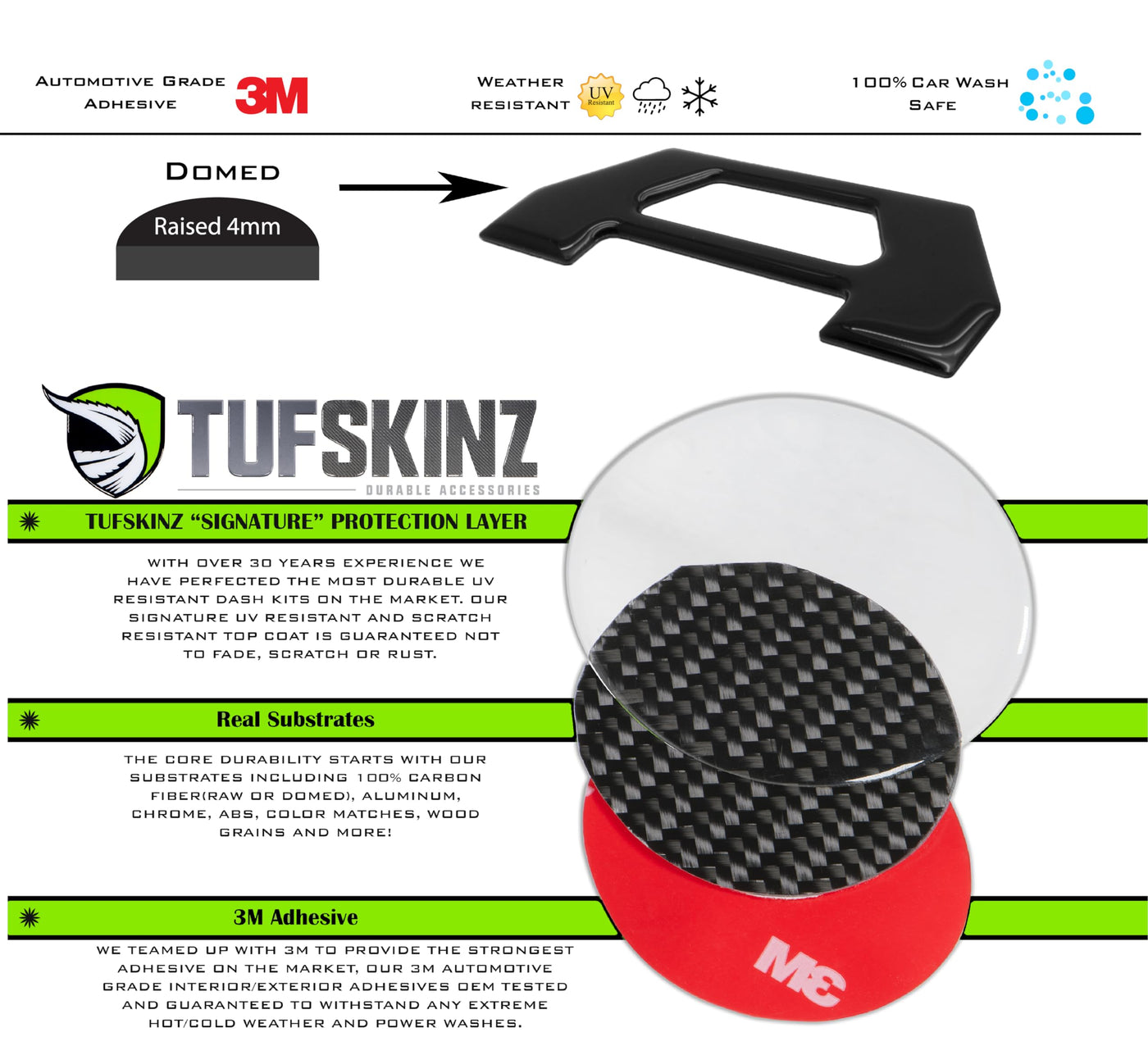 Description Add a new look to your Ford F-150 by installing TUFSKINZ Tailgate Letter Inserts. This kit features raised and stylish F-150 letters that are fittingly positioned on the trucks debossed tailgate. Material Type Domed (Raised 4mm) - Our Domed product line is our signature product. Each piece is manufactured with our 3-layer process that has been designed and tested to withstand all elements. FIRST LAYER - Superior UV Doming Resin that creates a high gloss, scratch resistant, durable finish. SECOND LAYER - Consists of a variety of substrates including our 100% Real Carbon Fiber, Chrome, Camouflage and Factory color matches to allow an array of custom options. THIRD LAYER - Utilizes our 3M Automotive Grade Adhesive that creates the perfect bond to the surface of the vehicle and makes the product installation an ease. **Only Exception: Real Carbon Fiber (Raw) is Raised 1mm** Easy Installation TUFSKINZ Tailgate Letter Insert pieces are designed to fit perfectly in the embossed F-150 area of the tailgate like a puzzle piece. Each letter insert is designed to fill the exact footprint of the flat debossed area. Prep and installation can simply be completed within 15 minutes.