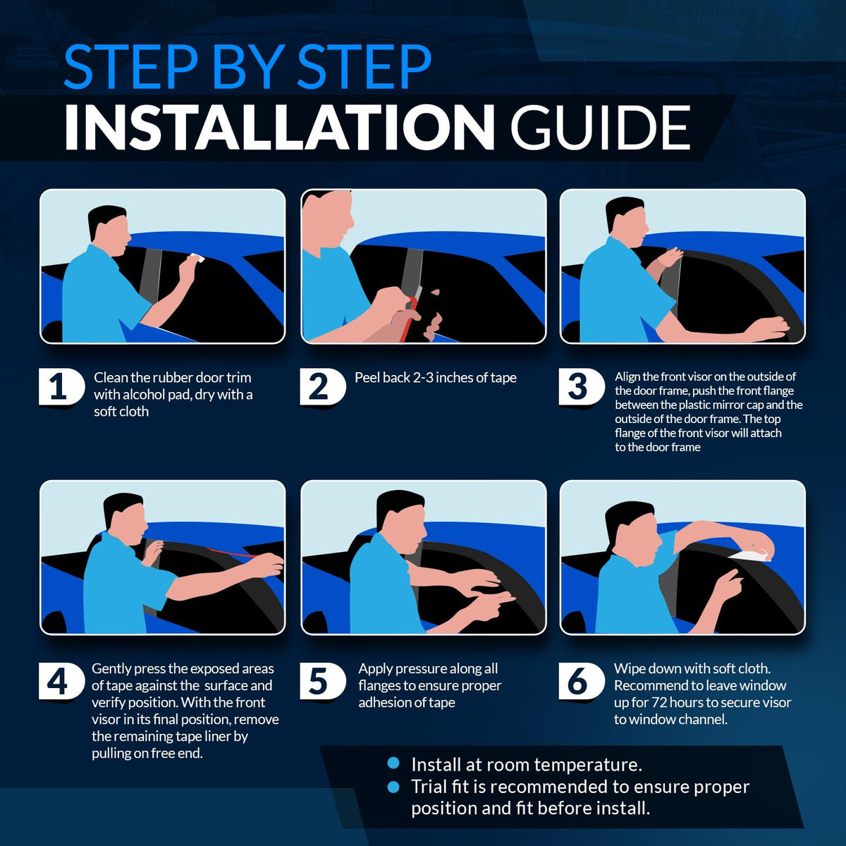 Q: How do I install the Tuningpros Window Visor?A: Installation of the Tuningpros Window Visor is straightforward and requires no drilling. Simply clean the window area, apply the included OEM approved tape, and press the visor into place for a secure fit.