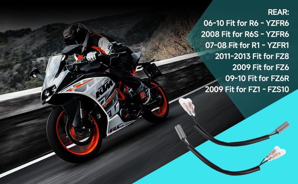 Q: What motorcycles are compatible with the Yctze Turn Signal Wiring Adapter?A: The Yctze Turn Signal Wiring Adapter is compatible with various Yamaha models including YZF-R6 (2003-2014), YZF-R1 (2002-2014), FZ6 (2004-2009), FZ10 (2008), and FZ1 (2009-2010). Please check your specific model before purchasing to ensure compatibility.