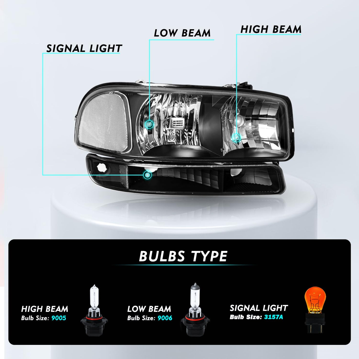 ? ?Suitable Models?Headlights Assembly Compatible With 99-07 Gmc Sierra 1500, 01-07 Gmc Sierra 1500Hd 2500Hd 3500Hd, 99-04 Gmc Sierra 2500, 99-06 Gmc Yukon, 00-06 Gmc Yukon Xl 1500 2500,2001 Sierra C3, Does Not Fit All Denali Trims. For 2007, Fits Classic Models Only. Bulbs Are Not Included. High Beam Bulb Type: 9005; Low Beam Bulb Type: 9006; Turn Signal: 3157A; Side Marker Light: 194; Drl: 4114.|? ?Premium Design?The Special Surface Coating Makes The Lens Scratchproof In Compliance With Regulations; Plug-N-Play Operation, Direct Original Equipment Replacement For The Stock Unit; Fully Sealed, Waterproof, Dust Resistant And Corrosion Resistant.|? ?Visibility Higher & Driving Safer?This Headlight Helps To Increase The Brightness So You Can See The Road Clearly At Night Or In Extreme Weather. Better Visibility Can Help You Avoid Traffic Accidents And Make Your Driving Safer.|? ?Replacement?Oem Part Number:15289275, 15850351, 16526135,15289276,15850352,16526136. Partslink Number: Gm2502188, Gm2503188.