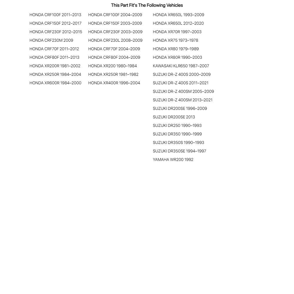 • Q: Is the Tusk Aluminum Tire Iron compatible with specific motorcycle models? A: Yes, the Tusk Aluminum Tire Iron is compatible with Honda CRF100F models from two thousand eleven to two thousand thirteen. This ensures a proper fit for tire changes on these motorcycles.