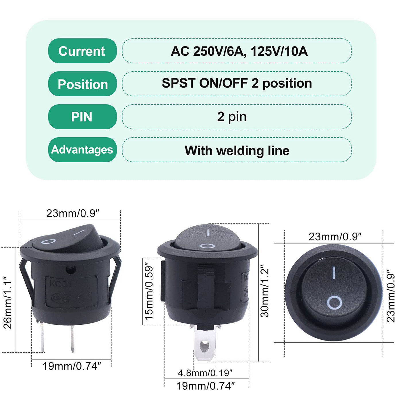 Twidec/10Pcs 12V Round Rocker Switch Ac 6A/250V 10A/125V Spst 2 Pin 2 Position On/Off Toggle Switch For Car Boat Automotive Rv Black With Pre-Soldered Wires(Quality Assurance For 1 Years)Kcd1-X-Y