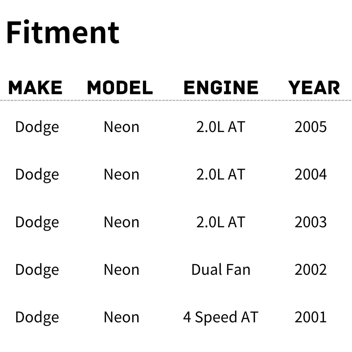 Replacement Radiator/Condenser Cooling Fan Assembly For Dodge Neon '01 4 Speed A/T, '02 Dual Fan, '03-'05 2.0L A/T, Partslink Number CH3115130, OEM Part Number 5019212AA/5103019AA/5103020AA/5019208AA/5019209AA, may have alternate model fitment.