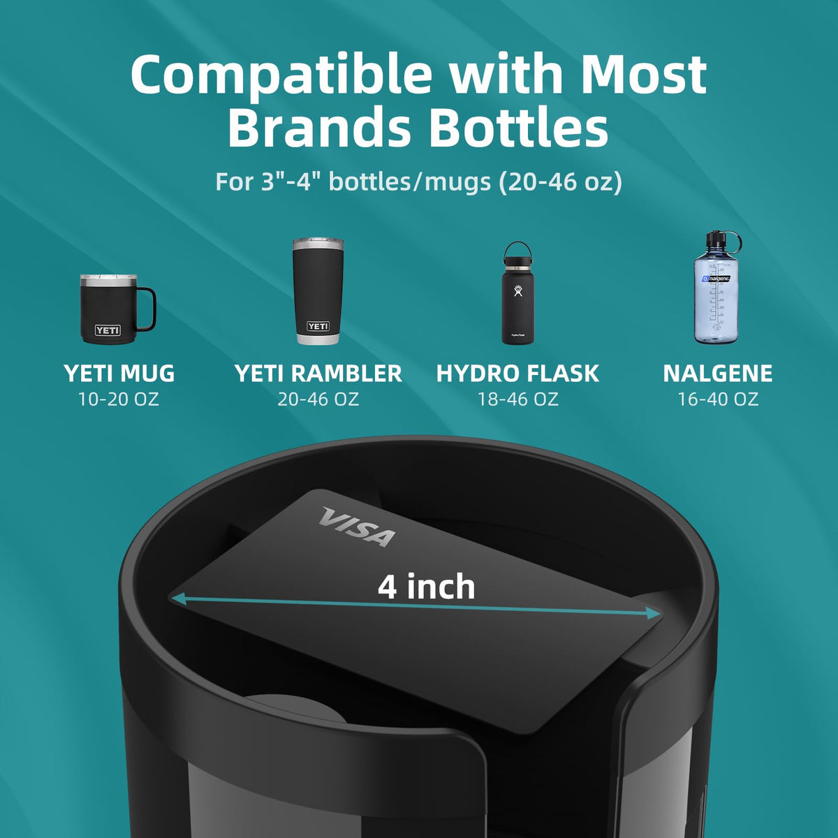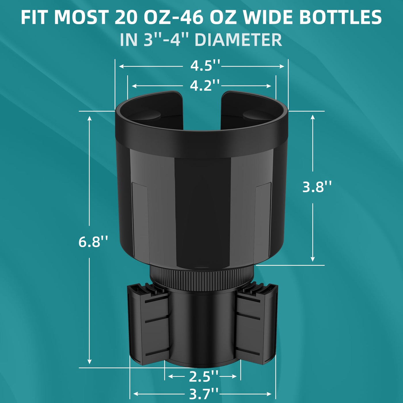 TYKOR car cup holder expander is large enough to hold most big water bottles. Cup holder extender is compatible with Yeti, Hydroflask and most other bottles 20-40oz. Meanwhile this cup holder adapter features a U shape slot allows mugs and bottles with handles to fit in. The expandable base allows this cup holder works great with most round shape car cup holder cars, such as Tesla, motorcycles, boats, trucks, RV's and golf-carts.