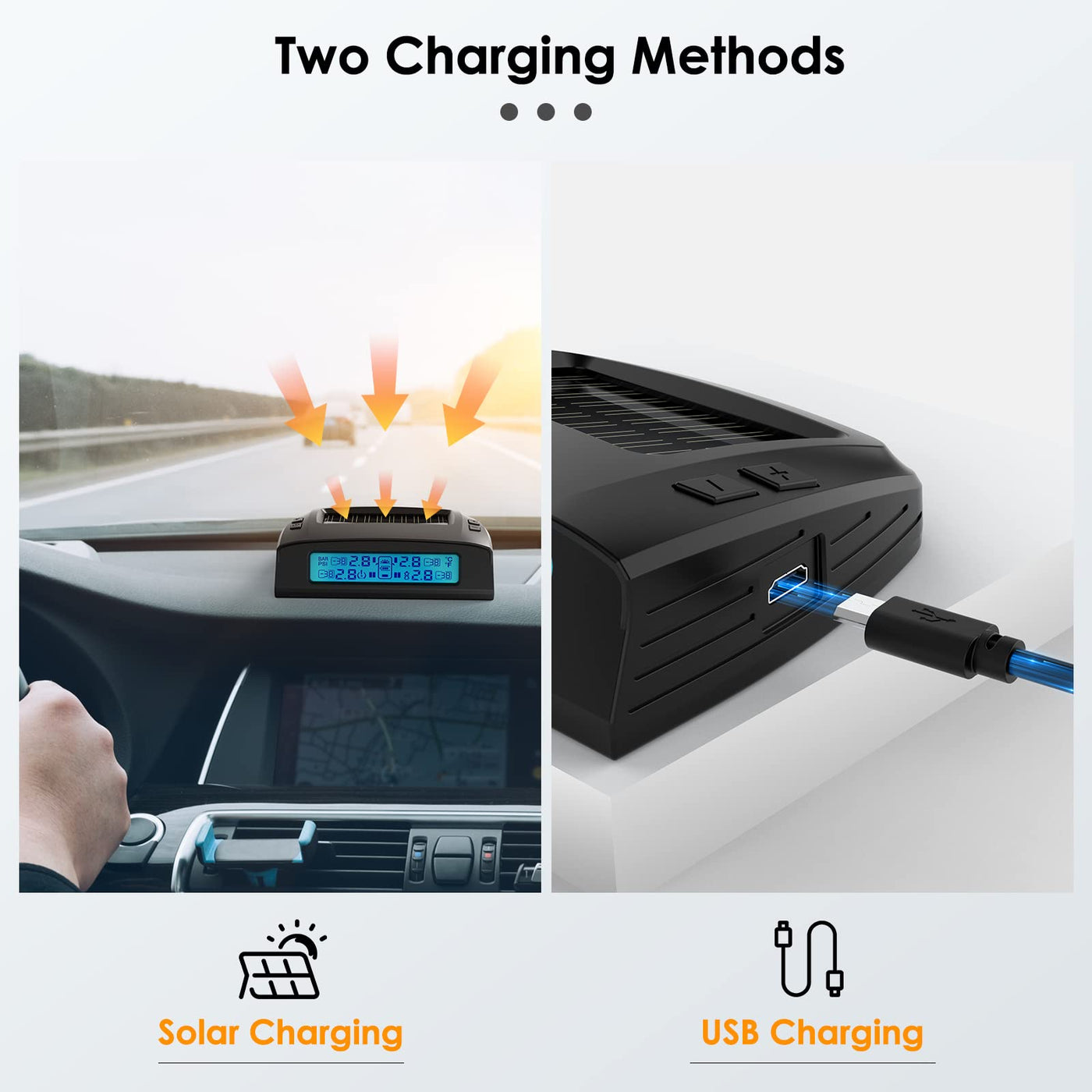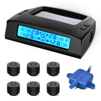 [Solar Ccharging and USB Charging]: Tymate Tire Pressure Monitoring System M7-3-6 has two charging methods. Tymate tire pressure monitoring system has a solar lithium battery panel that can automatically charge in the sun for continuous battery life, and can be supplemented by Micro USB charging when there is no sunlight. Two charging methods make the Tymate Tire Pressure Monitoring System M7-3 with 6 External Tpms Sensor for extra long standby time | [Five Alarm Types & Personalized Alarm Values]: Tymate tire pressure monitoring system M7-3-6 is equipped with five alarm modes (high pressure, low pressure, high temperature, rapid air leakage, sensor low battery alarm), and timely reports to the The driver provides abnormal tire conditions | [Repeater for Extended Range & Sensors for Precise Sensing]: Tymate Tire Pressure Monitoring System M7-3-6 has low sensor power consumption and long battery life (up to 2 years). Small size, light weight, high tire pressure sensing accuracy (error range not more than 3 PSI), and easy installation. It is dust and water resistant and wind and snow resistant. Repeaters can extend the sensing range beyond 45 feet | [Automatic Backlight and Real-time Monitoring]: Tymate tire pressure monitoring system M7-3-6 has a smart LCD screen, which can automatically display backlight in low light or strong light environment, and display data clearly. Real-time monitoring and real-time display of data, the data of 6 sensors are displayed at the same time, allowing the driver to know the tire pressure and temperature of all tires at any time | [Power Saving Mode and Vibration Wake Up]: When the car is stationary for 10 minutes without charging, the Tymate tire pressure monitoring system M7-3-6 will automatically enter the power saving mode, the display will be turned off, and no sensor data will be accepted . Press any key or vibrate the display, and the Tymate tire pressure monitoring system M7-3 with 6 External Tpms Sensor will return to the standby state again