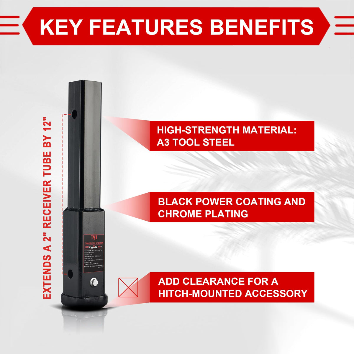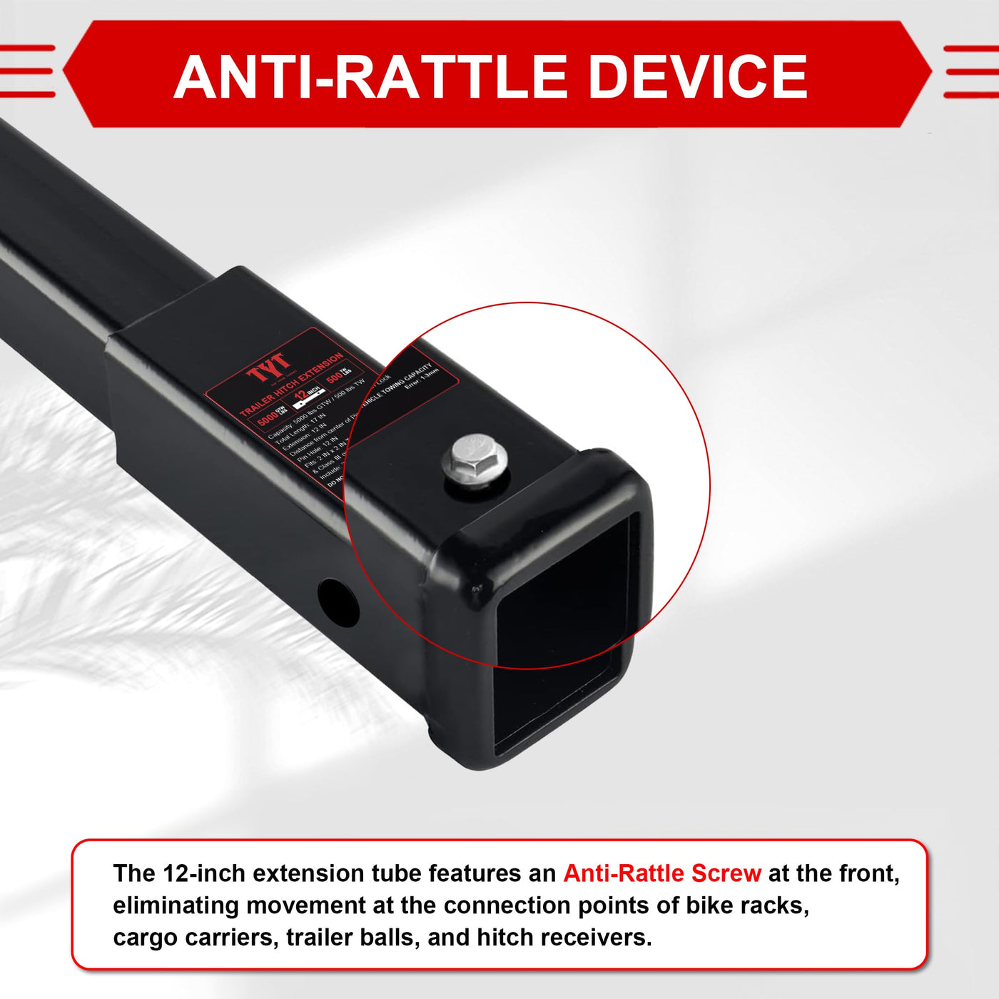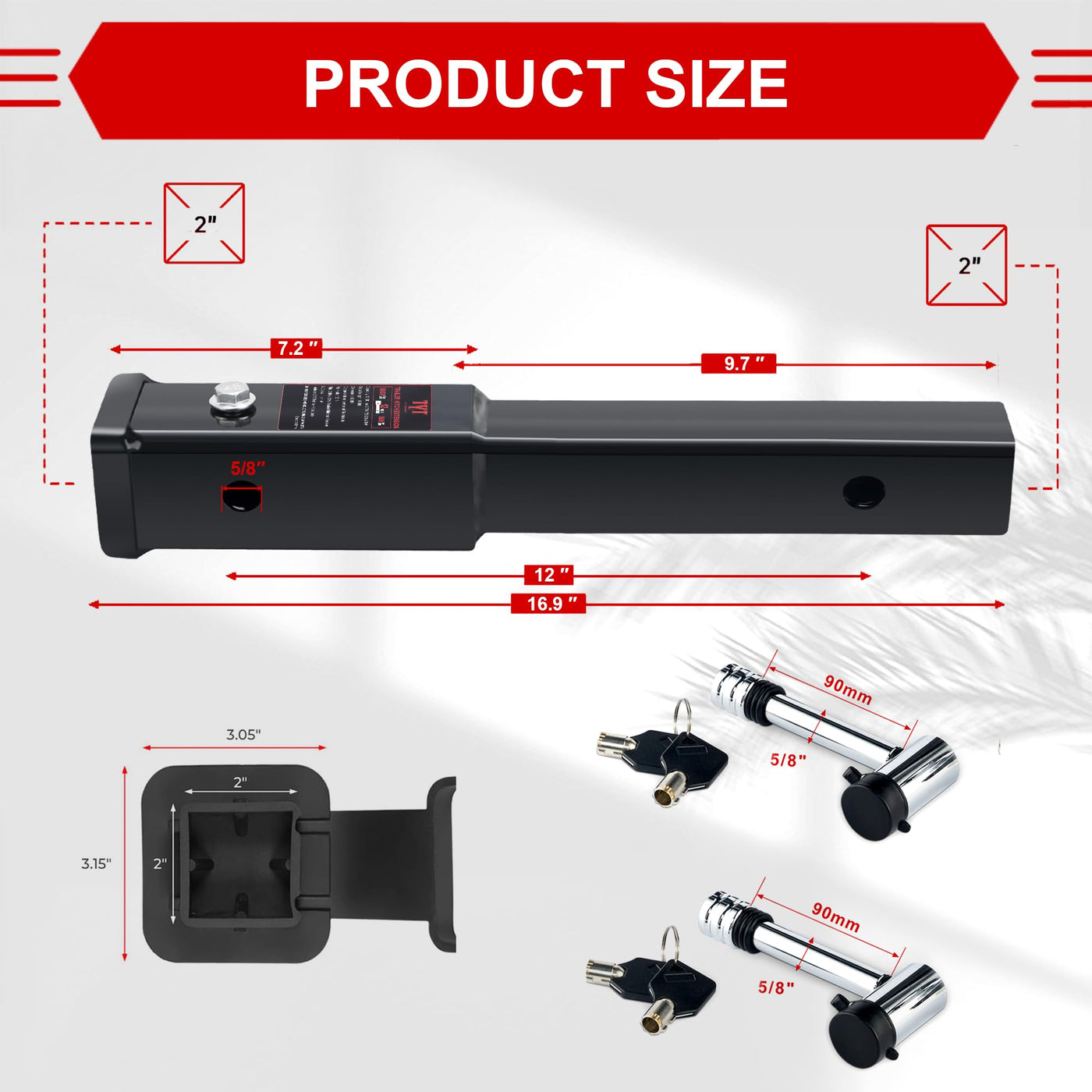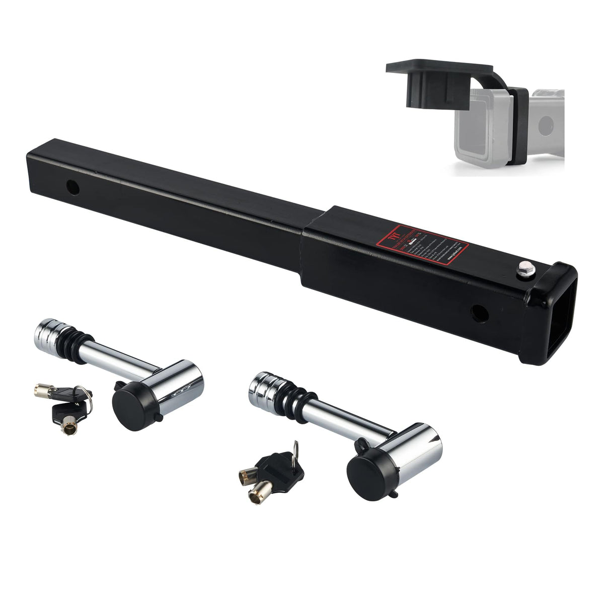 Specifications:- Designed for 2 '' x 2 '' trailer hitches - Total length: 23 ''- Weigh:5kg- Capacity: 5000 lbs TW / 500 lbs GTW- Compatible with 5/8 '' hitch pitch or lock- Measures 18 '' from the center of the hitch pin hole to the pin hole of the extension pieces-Hitch Pin included in the packExtra long reach:Have your cargo carrier stand far enough away from the spare tire, open the tailgate when pulling a travel trailer with your pickup, or leave a little extra room for your tee and trailer coupler.Corrosion resistant:Our trailer hitch extenders are gloss black powder coated with a generous amount of paint for continued protection against rust, rain, dirt, debris and UV damage, other threats of corrosion and harsh conditions for added durability.ABOUT US: TYT is a manufacturing enterprise specialized in the manufacturing and selling of sheet metal structures. We have a product R&D institution ,strict quality control group and specialized product testing equipment which guarantee the stable product quality control.Our products are widely exported to North America, Australia and other regions.we provide 2 year quality guarantee, please rest assured to use.