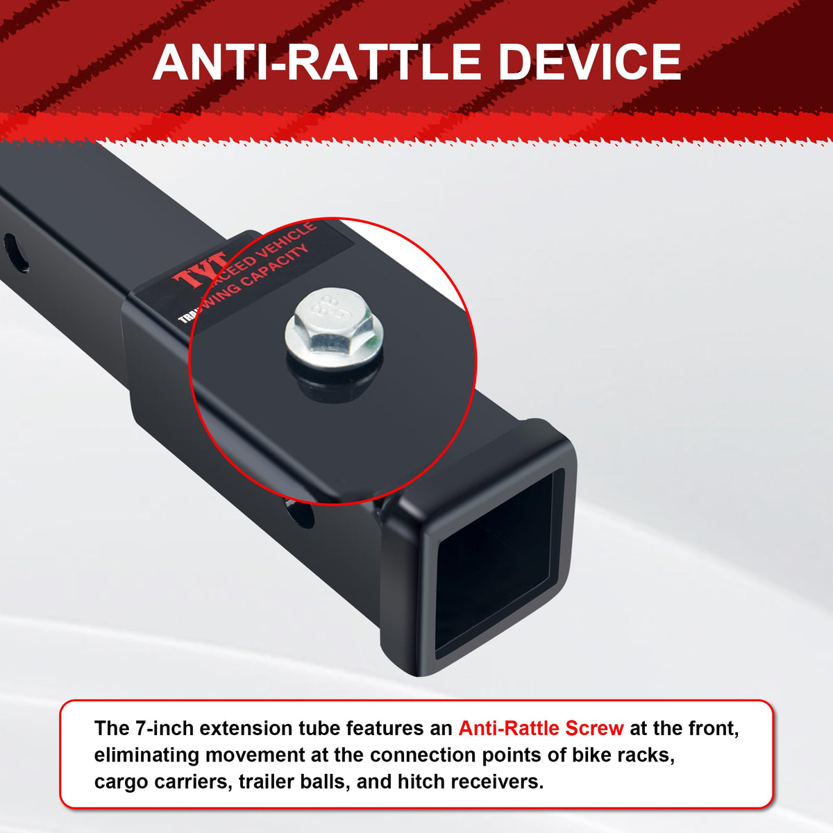This TYT Hitch Extender is made of high-quality steel and is designed to provide a secure connection between your trailer and vehicle. It has a 7-inch extension length and a 5/8 inch hitch pin, making it compatible with most 2-inch receivers. With its sturdy construction and durable finish, this hitch extender is built to last and withstand the toughest of conditions. Whether you 're towing a trailer or hauling a heavy load, this extender is the perfect solution for ensuring a safe and secure connection.
