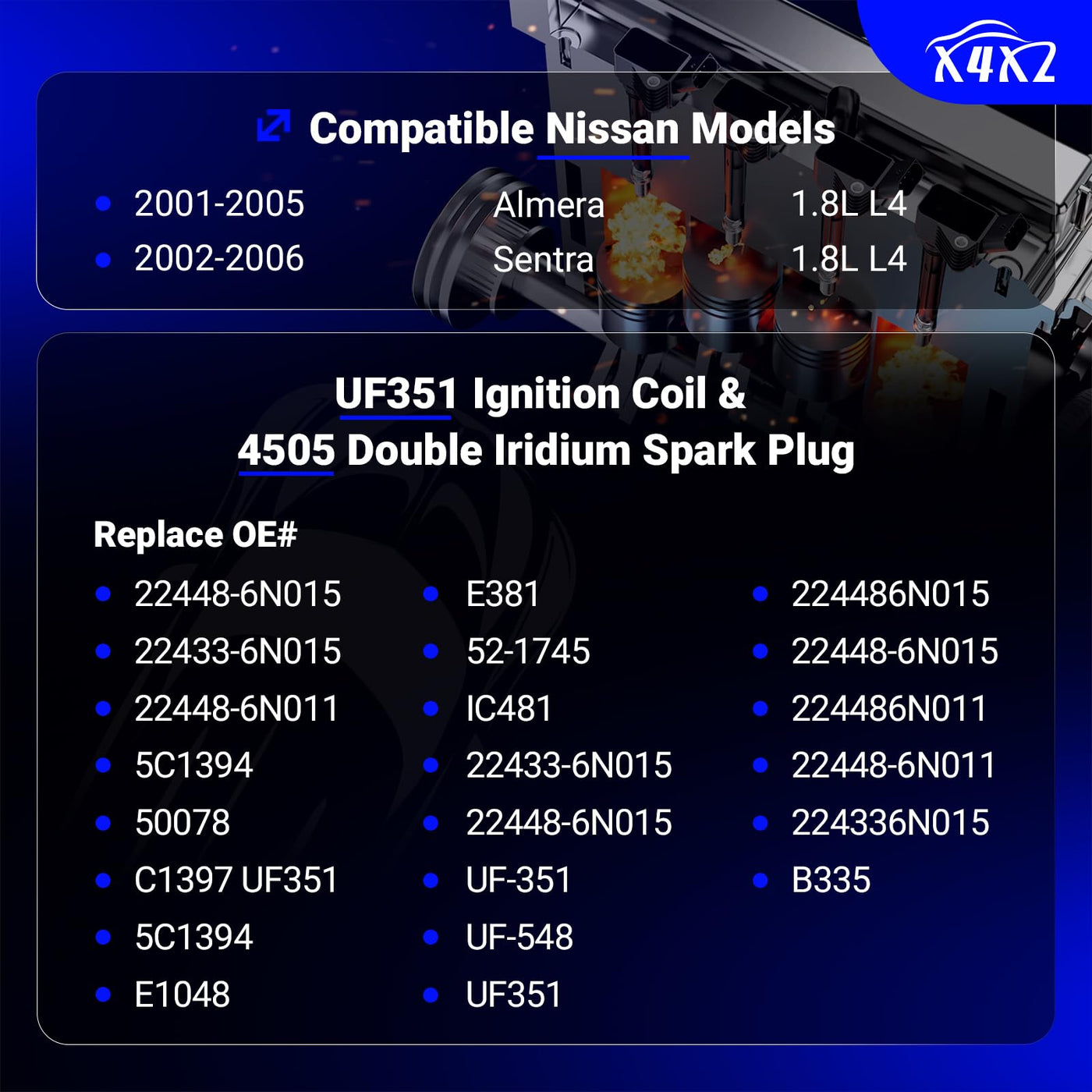 Q: What vehicles are compatible with the UF351 Ignition Coil and 4505 Double Iridium Spark Plug?A: The UF351 Ignition Coil and 4505 Double Iridium Spark Plug are compatible with the 2001-2005 Nissan Almera 1.8L L4 and the 2002-2006 Nissan Sentra 1.8L L4. Please refer to the product images for additional vehicle compatibility.