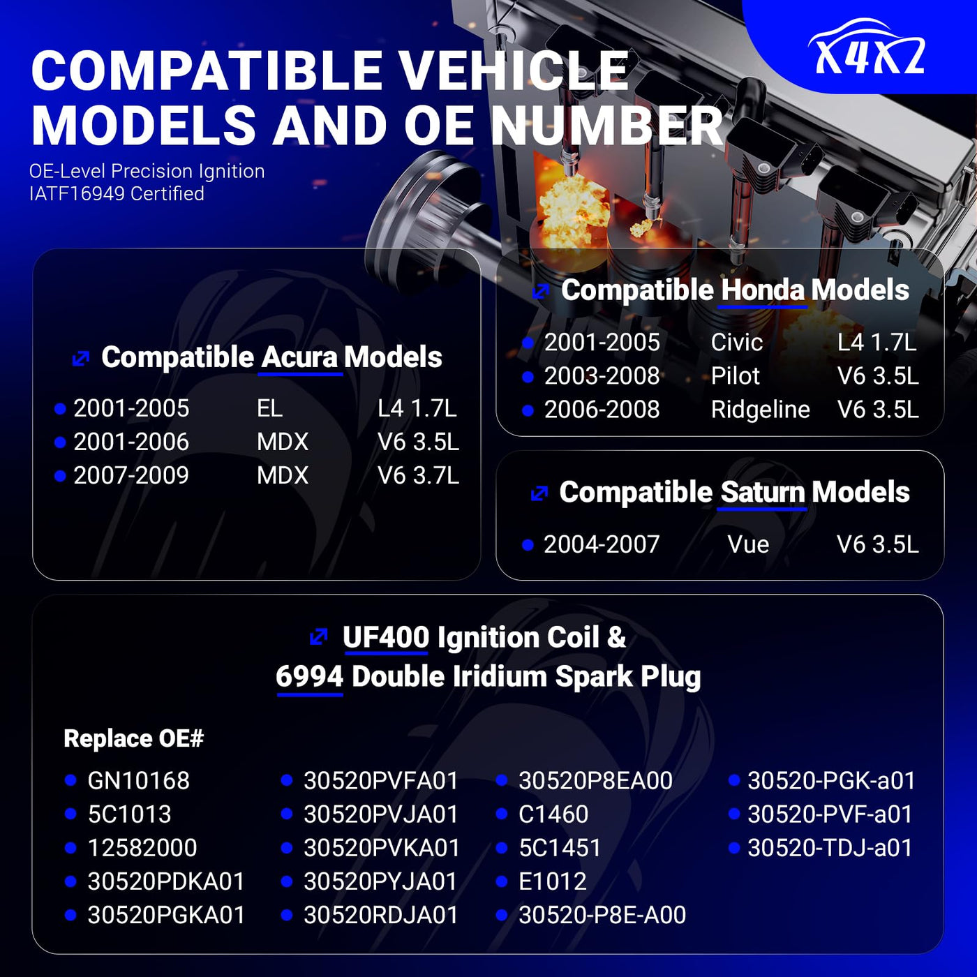 Q: What vehicles are compatible with the UF400 ignition coil and double iridium spark plug set?A: The UF400 ignition coil and double iridium spark plug set is compatible with various models including 2001-2005 Acura EL L4 1.7L, 2001-2006 Acura MDX V6 3.5L, 2007-2009 Acura MDX V6 3.7L, 2001-2005 Honda Civic L4 1.7L, 2003-2008 Honda Pilot V6 3.5L, 2006-2008 Honda Ridgeline V6 3.5L, and 2004-2007 Saturn Vue V6 3.5L.