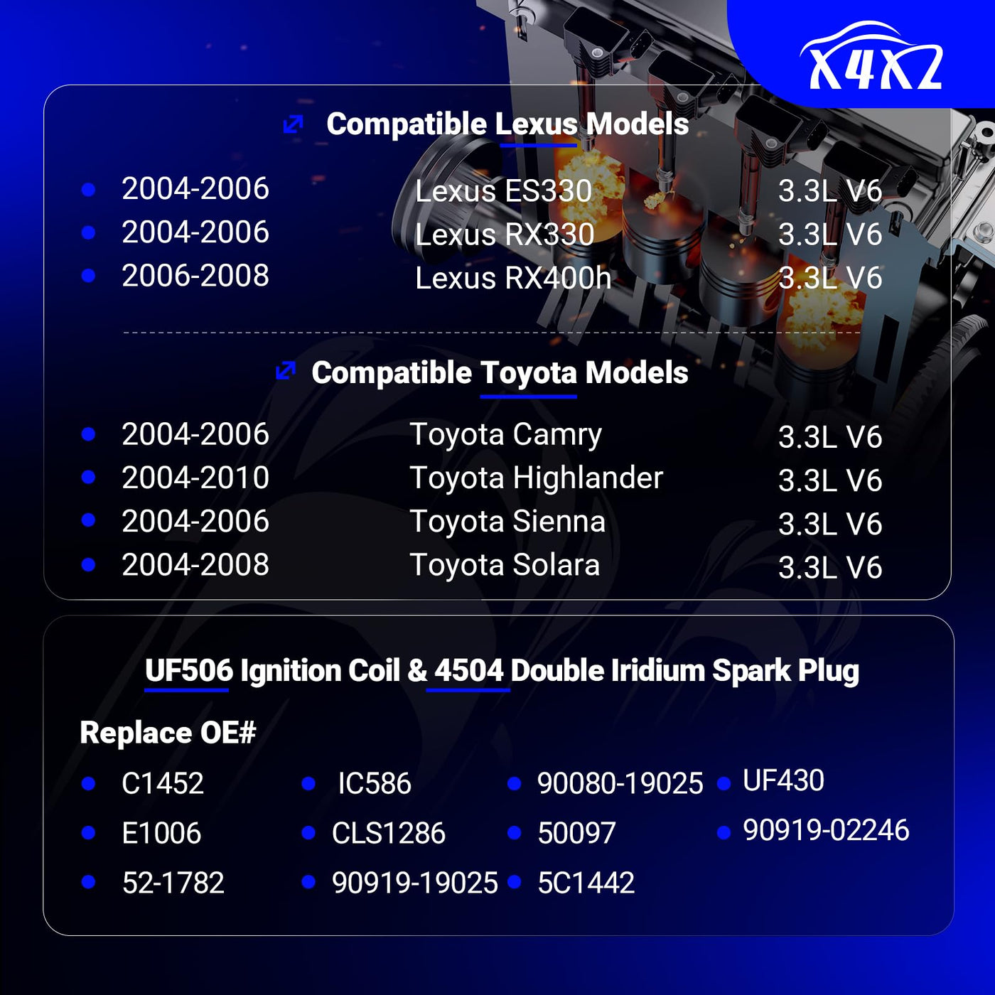 Q: What vehicles are compatible with the UF506 Ignition Coil and 4504 Double Iridium Spark Plug?A: The UF506 Ignition Coil and 4504 Double Iridium Spark Plug are compatible with several vehicles, including the 2004-2006 Lexus ES330, 2004-2006 Lexus RX330, 2006-2008 Lexus RX400h, 2004-2006 Toyota Camry, 2004-2010 Toyota Highlander, 2004-2006 Toyota Sienna, and 2004-2008 Toyota Solara, all equipped with a 3.3L V6 engine.
