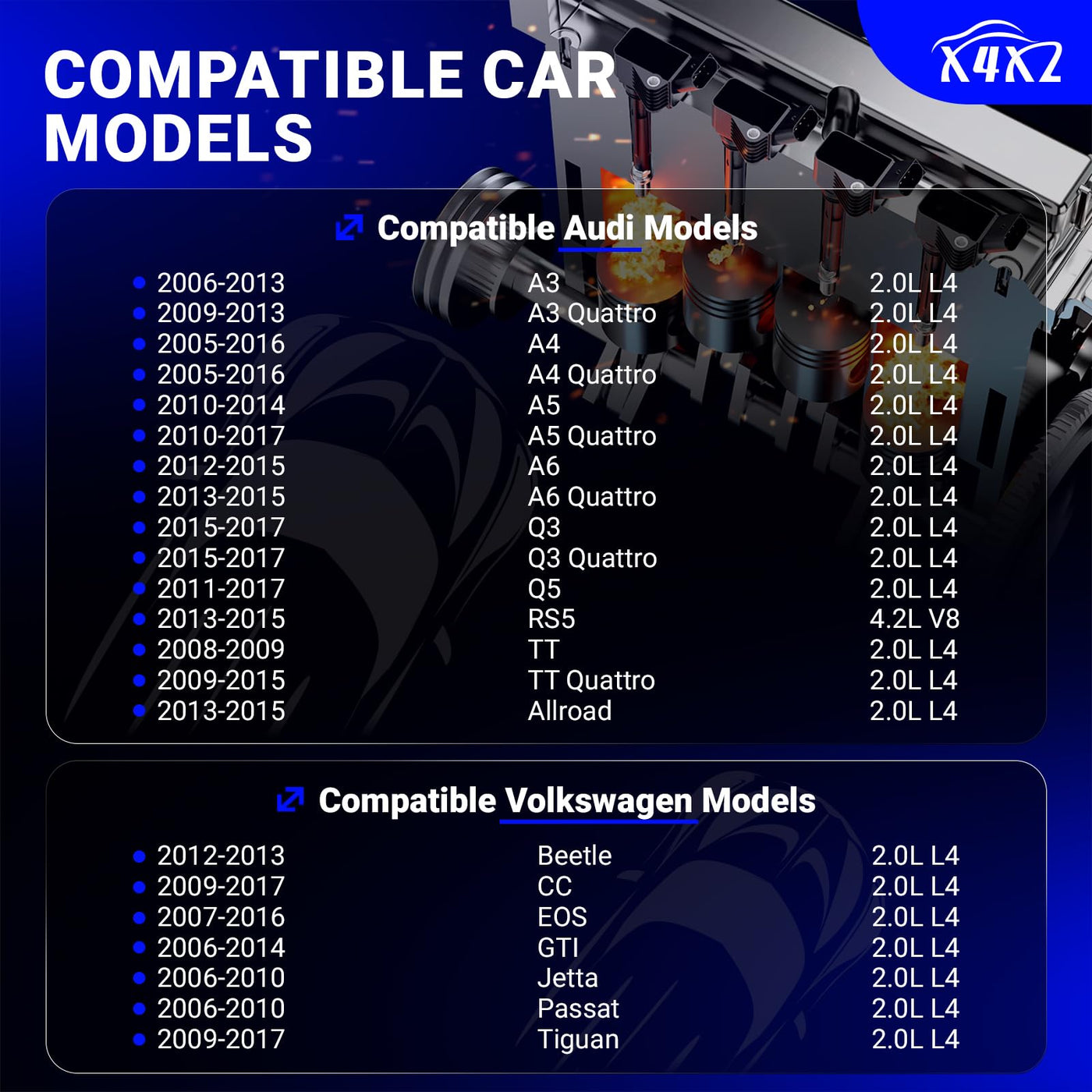 Q: What vehicles are compatible with the UF575 Ignition Coil and 1675 Double Iridium Spark Plug?A: The UF575 Ignition Coil and 1675 Double Iridium Spark Plug are compatible with various Audi models including A3, A4, A5, A6, Q5, R8, TT, RS4, RS5, and Volkswagen models such as Jetta, Passat, Tiguan, Beetle, CC, and Golf GTI, spanning model years from 2006 to 2017. Always check your vehicle's specifications to ensure compatibility.
