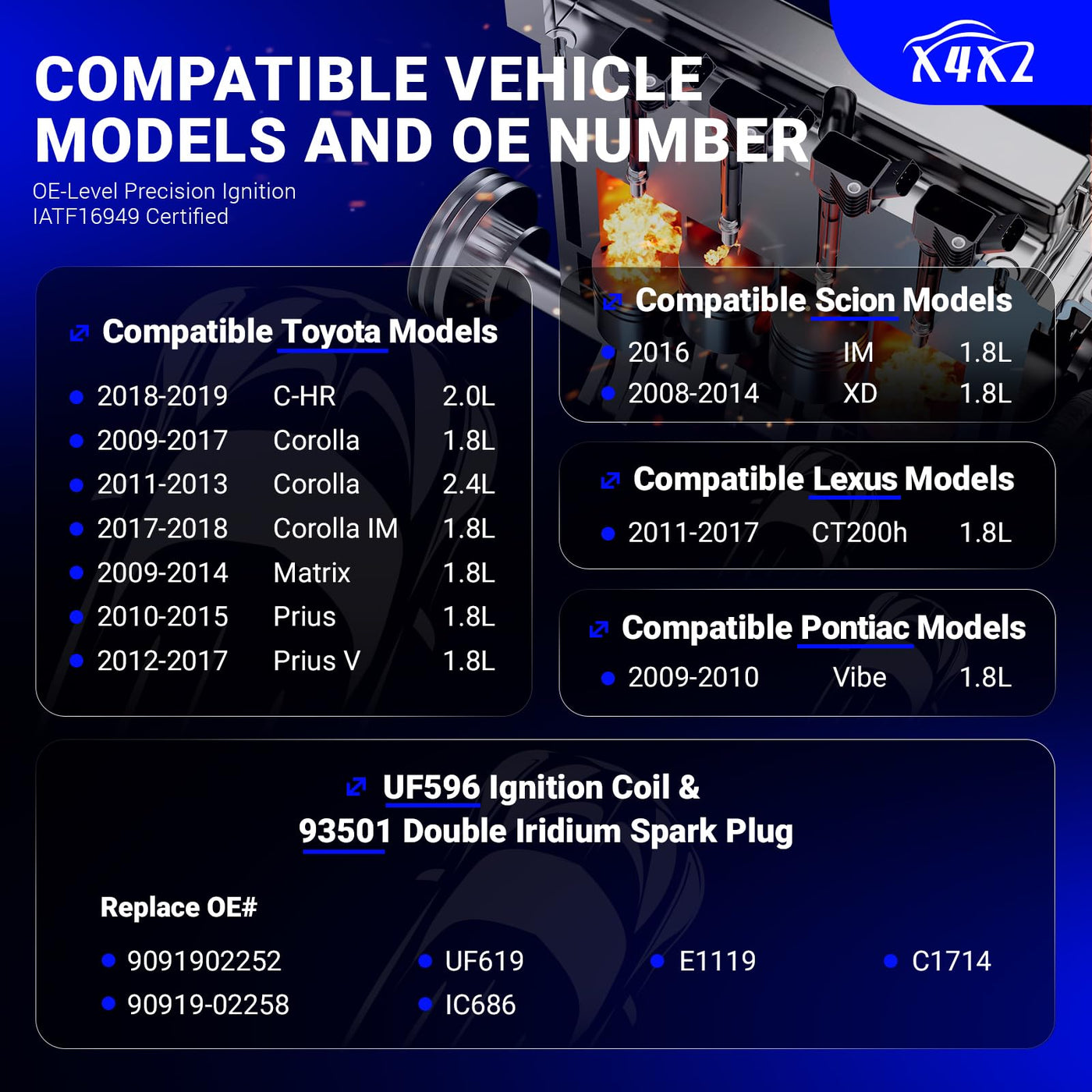 Manufacturer Part Number: Uf596+93501 Replacement Part Number: 9091902252, 90919-02258, Uf619, Ic686, E1119, C1714 Compatible With The Following Vehicles: For 2011-2017 Lexus Ct200H 1.8L For 2009-2010 Pontiac Vibe 1.8L For 2016 Scion Im 1.8L For 2008-2014 Scion Xd 1.8L For 2018-2019 Toyota C-Hr 2.0L For 2009-2017 Toyota Corolla 1.8L For 2011-2013 Toyota Corolla 2.4L For 2017-2018 Toyota Corolla Im 1.8L For 2009-2014 Toyota Matrix 1.8L For 2010-2015 Toyota Prius 1.8L For 2012-2017 Toyota Prius V 1.8L