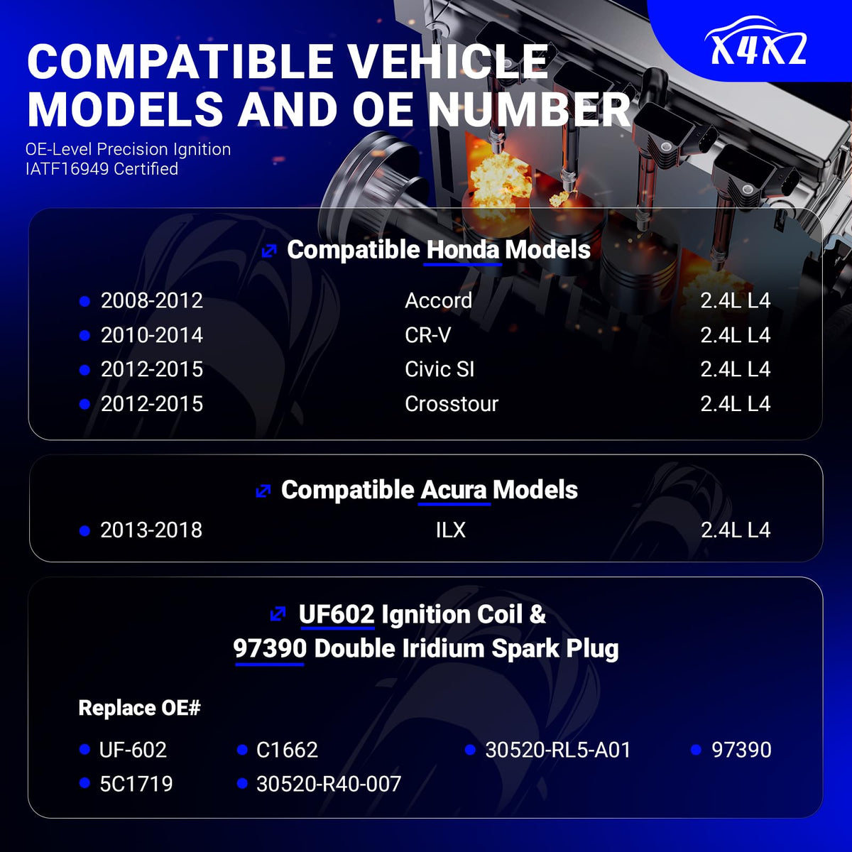 Q: What vehicles are compatible with the UF602 ignition coil and 97390 spark plug?A: The UF602 ignition coil and 97390 double iridium spark plug are compatible with several Honda and Acura models, including the 2008-2012 Honda Accord 2.4L L4, 2010-2014 Honda CR-V 2.4L L4, 2012-2015 Honda Civic SI 2.4L L4, 2012-2015 Honda Crosstour 2.4L L4, and 2013-2018 Acura ILX 2.4L L4.