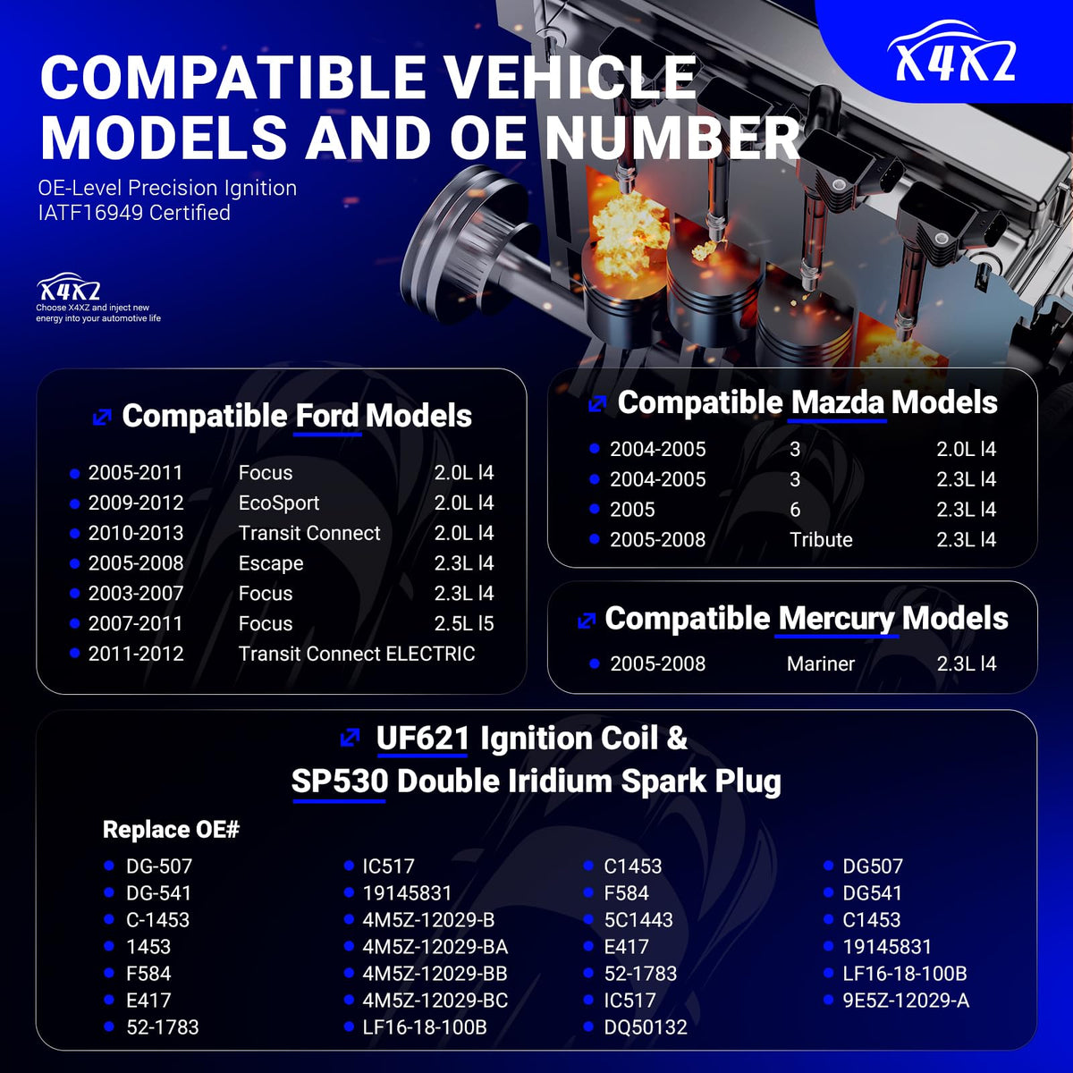 Q: What vehicles are compatible with the UF621 Ignition Coil and SP530 Spark Plug?A: The UF621 Ignition Coil and SP530 Double Iridium Spark Plug are compatible with various models including the 2004-2005 Mazda 3 (2.0L and 2.3L L4), 2005 Mazda 6 (2.3L L4), 2005-2008 Mazda Tribute (2.3L L4), 2005-2011 Ford Focus (2.0L and 2.3L L4, 2.5L L5), 2005-2008 Ford Escape (2.3L L4), 2009-2012 Ford EcoSport (2.0L L4), 2010-2013 Ford Transit Connect (2.0L L4 and Electric), and 2005-2008 Mercury Mariner (2.3L L4). Please check the product description for a complete list.