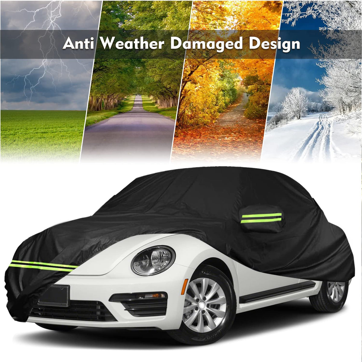 ?Customized Car Cover for 1998-2022 Volkswagen New Beetle?: Waterproof Car Cover for 1998-2022 Volkswagen New Beetle, custom-fit cover and easy installation. Package include 1 pack of 1998-2022 Volkswagen New Beetle car cover with free storage bag inside for convenient to storage. | ?6 Layers Sturdy Material?: ULROLIT car cover is made of high-quality 210T polyester taffeta fabric, high reflective silver spray coating, waterproof silver coated layer, black waterproof coating, Composite layer, soft lint layer. These car cover can be used for outdoor and indoor use, non-fading, heat resistance, anti-UV and 100% waterproof. | ?All Weather Protection?: These car cover provides all-weather protection for your car, protect your vehicle from dust, snow, sun, industrial pollution, bird droppings, rain, moisture and others. The waterproof effect is extremely strong, durable and safe under severe conditions. | ?Driver Side Zipper Design?: There is a zipper on driver side on car cover for easy access. You can easily get in the car even the car has been full covered, and get out easily without taking off the cover. 5 night reflective stripes are affixed on the surface, so you can easily see the outline of the car and avoid accidents at night. Mirror Pockets can perfectly protect your mirror from damage. | ?4 Lower Fixing Straps?: Four fixing straps used on the car four wheels to make sure the cover can keep your car stay in place even on windy days. The elastic Strap at the bottom of the car cover, can fit your car well and protect your car cover from blowing off. Equipped with a windproof buckle and a security lock, enahnce the fix and safety function of the car cover, better protect your car from heavy wind weather.