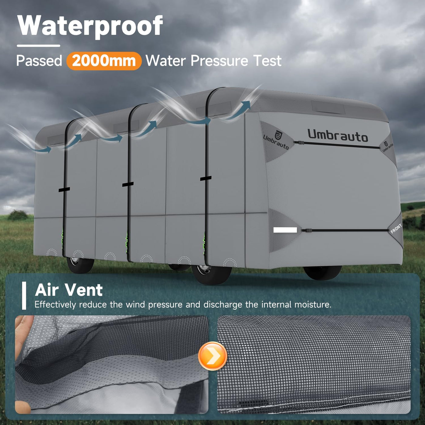 Q: How does the ventilation system work in the Umbrauto RV Cover?A: The cover includes six vents that help reduce wind pressure and discharge internal moisture, ensuring good air permeability and keeping the inside of the cover clean and dry.