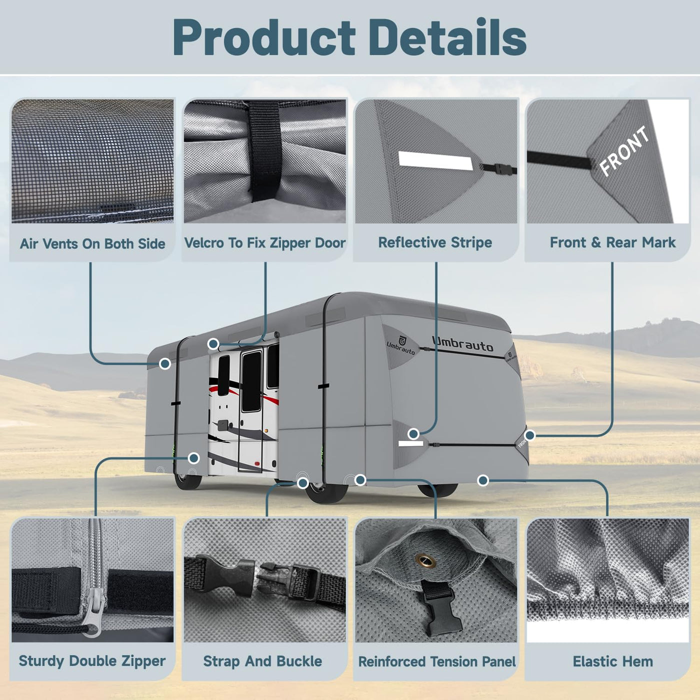 Q: How does the Umbrauto RV cover protect against weather elements?A: This RV cover features a heavy-duty 7-layer construction that includes anti-UV composites and a waterproof membrane, providing excellent protection against rain, snow, and UV rays to reduce premature aging.