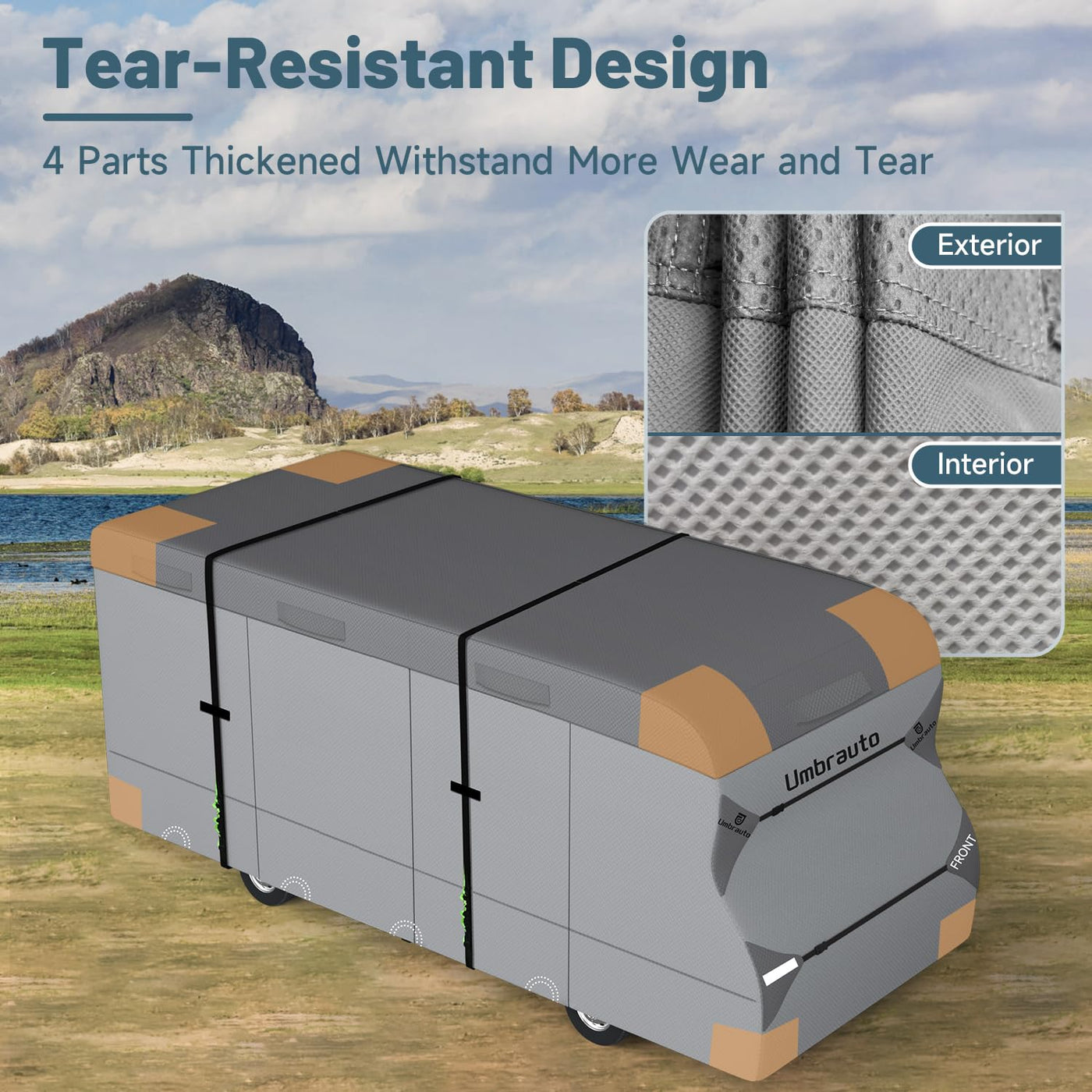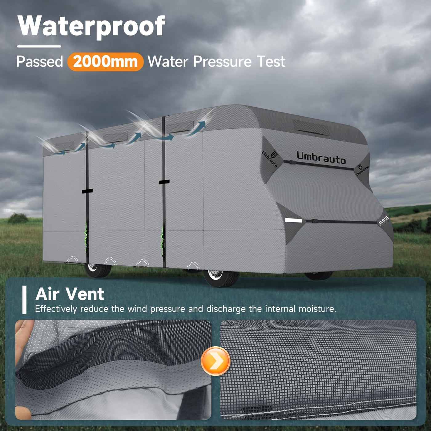 Q: Is the Umbrauto RV Cover waterproof?A: Yes, the Umbrauto RV Cover includes a built-in waterproof film within its 7 layers of fabric, ensuring strong waterproof performance that protects your motorhome from rain and snow.