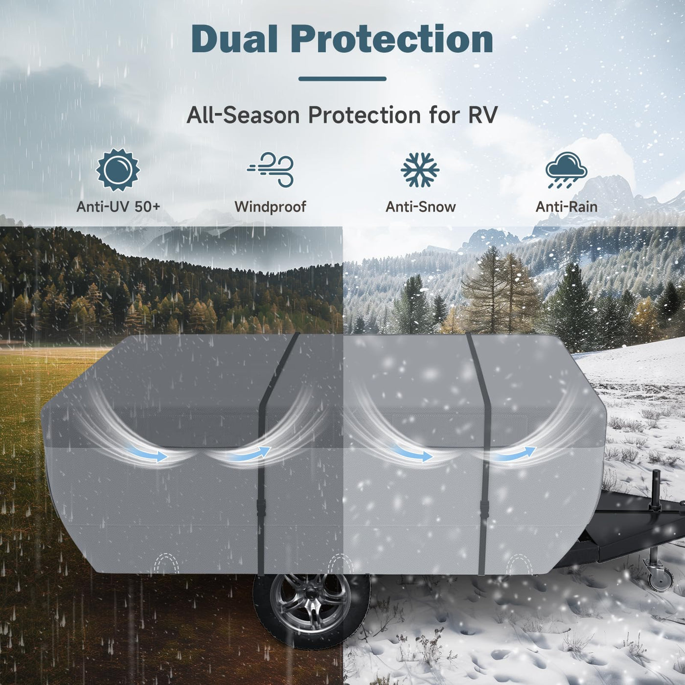 Q: How does the Umbrauto camper cover protect against weather elements?A: This camper cover features a heavy-duty 7-layer top that is water-resistant, tear-resistant, and provides all-weather protection against rain, snow, dust, and scratches.