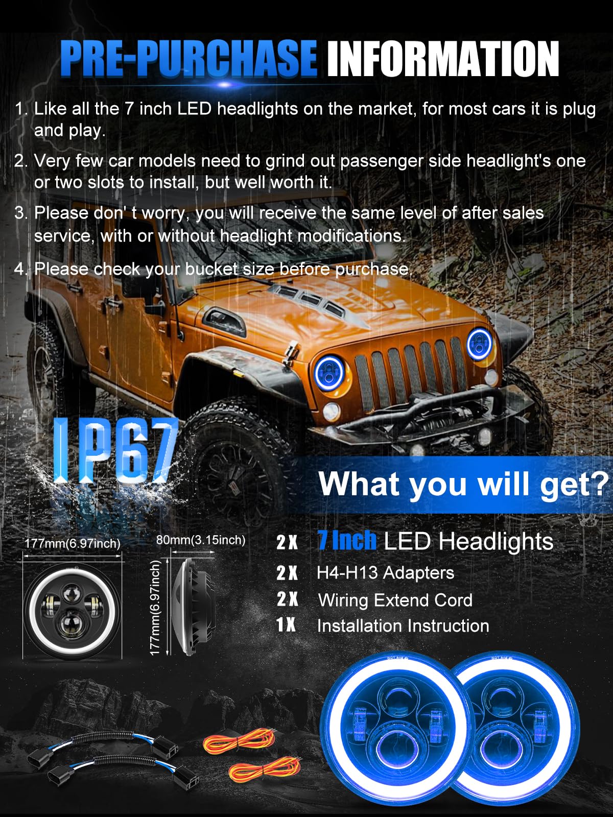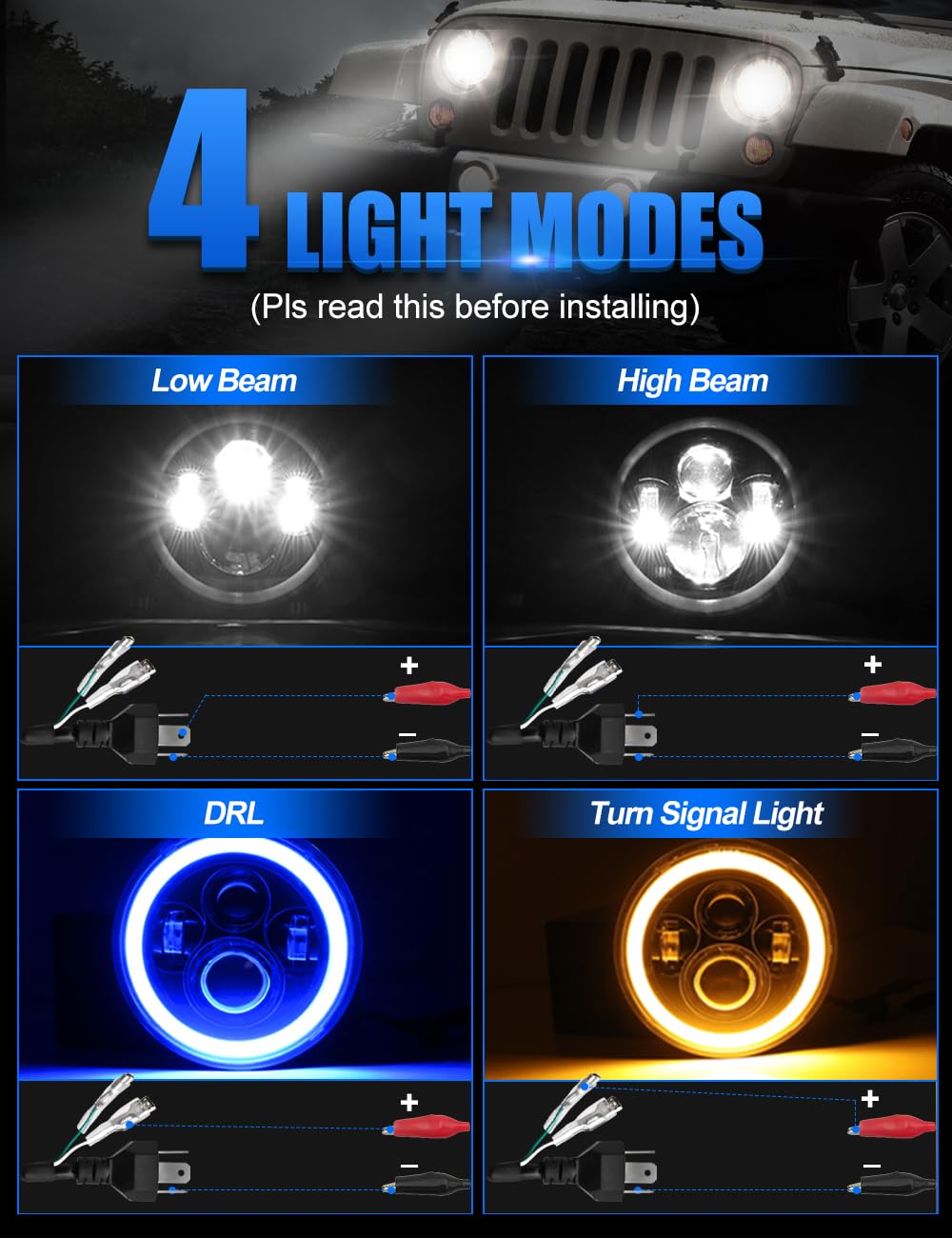 Uni-Shine 7 Inch Led Headlight, Round H6024 Led Headlight Blue Halo Headlight Running Amber Turn Signal Seal Beam 7'' Round Head